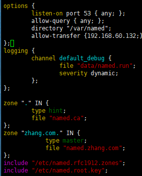 [root@server ~]# vim /etc/named.conflisten-on port 53 { any; };allow-query { any; };directory "/var/named";allow-transfer { 192.168.60.132; };zone "zhang.com." IN {type master;file "named.zhang.com";};