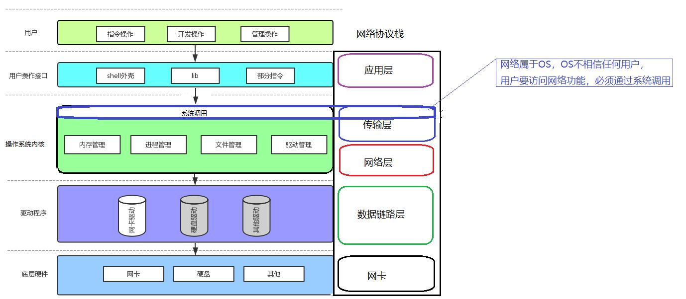 之前,我们从os系统的角度认识了网络。网络本身是属于OS的,既然属于os,那么就一定是内核态的,我们想访问网络必须通过系统调用。如图: