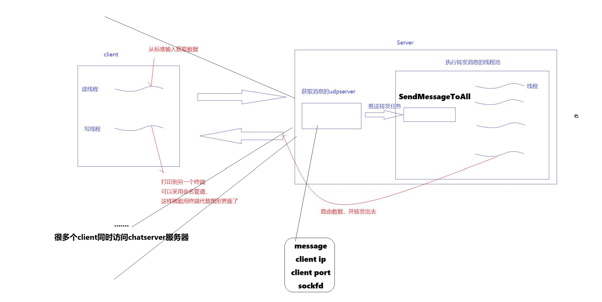 private:bool IsExist(InetAddr &client){for (auto user : _online_users){if (user == client){return true;}}return false;}void Adduser(InetAddr &client){if (IsExist(client))return;_online_users.emplace_back(client);}void SendMessageToAll(const std::string &msg, int sockfd){// 都向Server的sockfd中写for(auto user: _online_users){LOG(LogLevel::DEBUG) << "route [" << msg << "] to: " << user.SocketToString(); std::string info = user.SocketToString(); info += "# ";info += msg; // XXXX-PORT# 你好sendto(sockfd, info.c_str(), info.size(), 0, (const sockaddr*)user.Addr(), user.len());}}void DelUser(InetAddr& user, const std::string& msg){// 暂时if(msg != "q") return ;auto iter = _online_users.begin();for(; iter < _online_users.end(); iter++){if(*iter == user){LOG(LogLevel::DEBUG) << user.SocketToString() << "已经被移除";_online_users.erase(iter);break;}}}public:Route(){}// 群聊void RouteMessageToAll(const std::string &msg, InetAddr &client, int sockfd){// 添加用户(里面自已有判读)Adduser(client);// 统一发送消息SendMessageToAll(msg, sockfd);// 删除用户(里面自已有判读)DelUser(client, msg);}// 单聊// void RouteMessageToOne(const std::string& msg, InetAddr& client, int sockfd)// {// }~Route() {}
