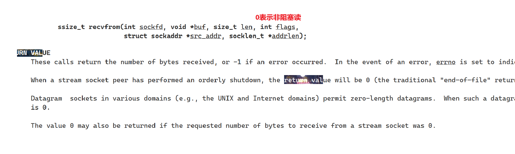 返回值,如果返回0,表明对端关闭连接,如果<0,表明读取错误。否则,就是读取的数据个数。