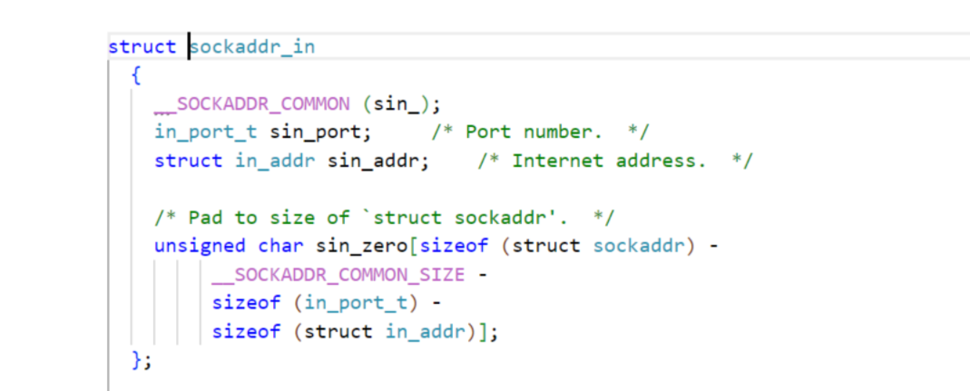其中socket_in的第一个字段sin_family 表明是网络套接字还是域间套接字(可以展开宏看看),关于地址族。第二个字段sin_port为套接字的端口号,sin_addr为套接字的ip地址,最后一个为填充字段