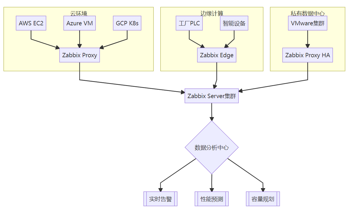 flowchart TDsubgraph 云环境A[AWS EC2] --> B[Zabbix Proxy]C[Azure VM] --> BD[GCP K8s] --> Bendsubgraph 边缘计算E[工厂PLC] --> F[Zabbix Edge]G[智能设备] --> Fendsubgraph 私有数据中心H[VMware集群] --> I[Zabbix Proxy HA]endB --> J[Zabbix Server集群]F --> JI --> JJ --> K{数据分析中心}K --> L[[实时告警]]K --> M[[性能预测]]K --> N[[容量规划]]