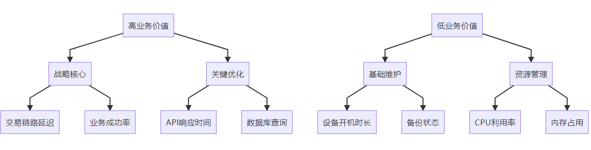 graph TDA[高业务价值] --> B[战略核心]B --> C1["交易链路延迟"]B --> C2["业务成功率"]A --> D[关键优化]D --> E1["API响应时间"]D --> E2["数据库查询"]F[低业务价值] --> G[基础维护]G --> H1["设备开机时长"]G --> H2["备份状态"]F --> I[资源管理]I --> J1["CPU利用率"]I --> J2["内存占用"]