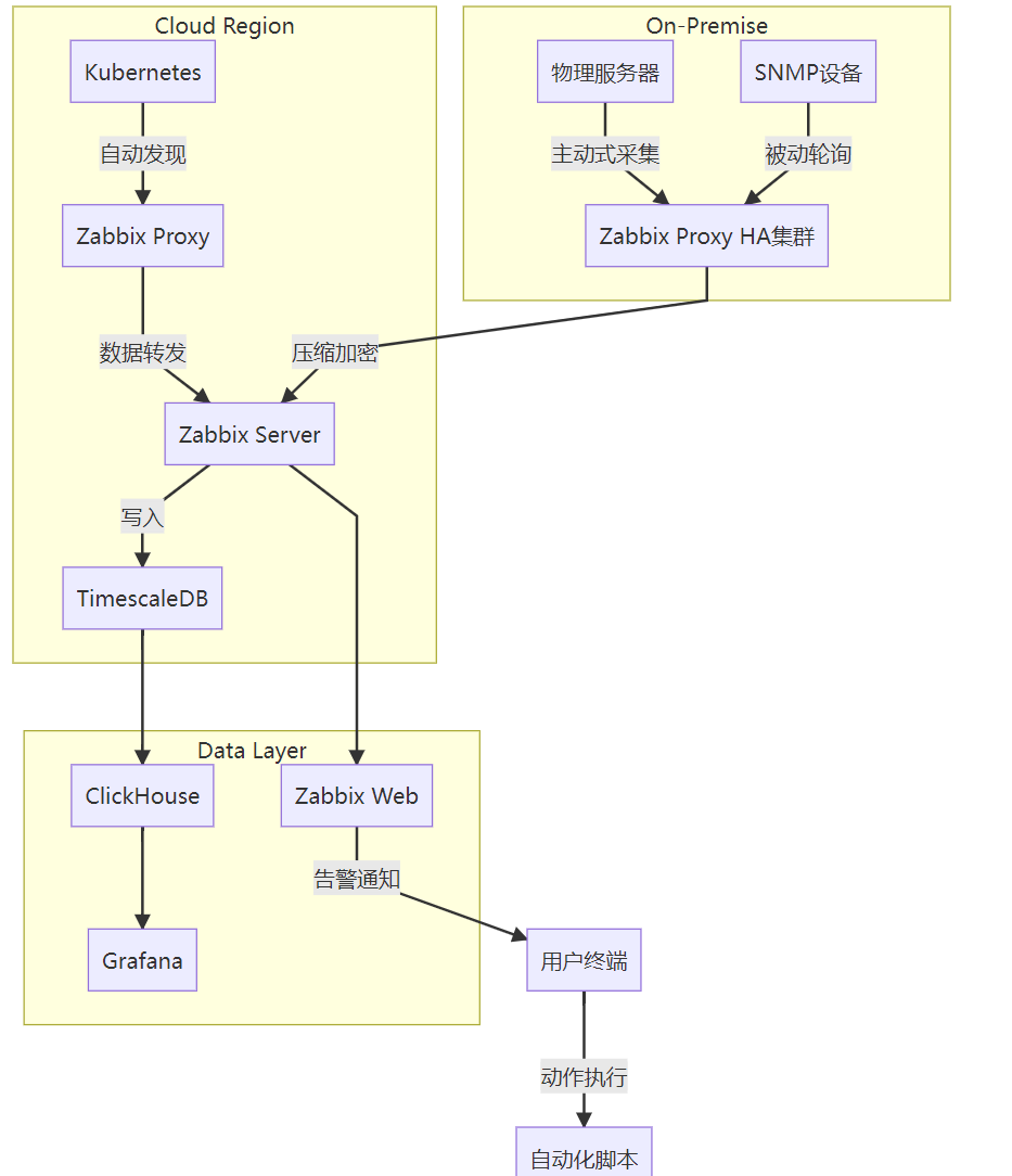 graph TDsubgraph Cloud RegionA[Zabbix Proxy] -->|数据转发| B[Zabbix Server]B -->|写入| C[TimescaleDB]D[Kubernetes] -->|自动发现| Aendsubgraph On-PremiseE[Zabbix Proxy HA集群] -->|压缩加密| BF[物理服务器] -->|主动式采集| EG[SNMP设备] -->|被动轮询| Eendsubgraph Data LayerC --> H[ClickHouse]H --> I[Grafana]B --> J[Zabbix Web]endJ -->|告警通知| K[用户终端]K -->|动作执行| M[自动化脚本]