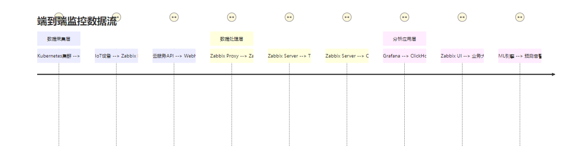 journeytitle 端到端监控数据流section 数据采集层Kubernetes集群 --> Zabbix Agent:eBPF实时指标IoT设备 --> Zabbix Proxy:Modbus协议云服务API --> Webhook:JSON数据section 数据处理层Zabbix Proxy --> Zabbix Server:加密压缩Zabbix Server --> TimescaleDB:存储短期数据Zabbix Server --> ClickHouse:存储长期历史section 分析应用层Grafana --> ClickHouse:SQL查询Zabbix UI --> 业务大屏:实时可视化ML引擎 --> 预测告警:异常检测