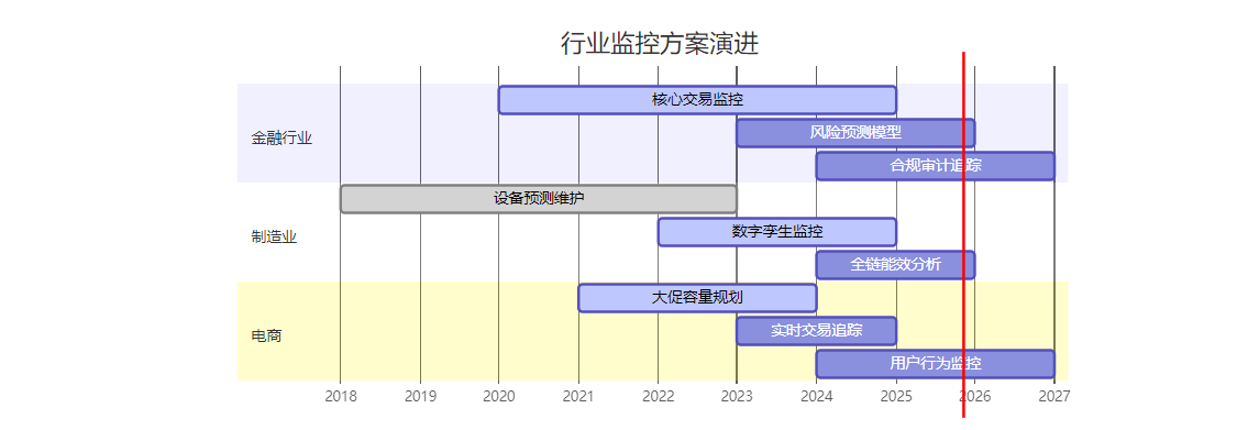 gantt图展示不同行业的监控方案技术演进路线实时交互:所有图表支持在支持 Mermaid 的平台(如 Zabbix/Grafana)中点击钻取