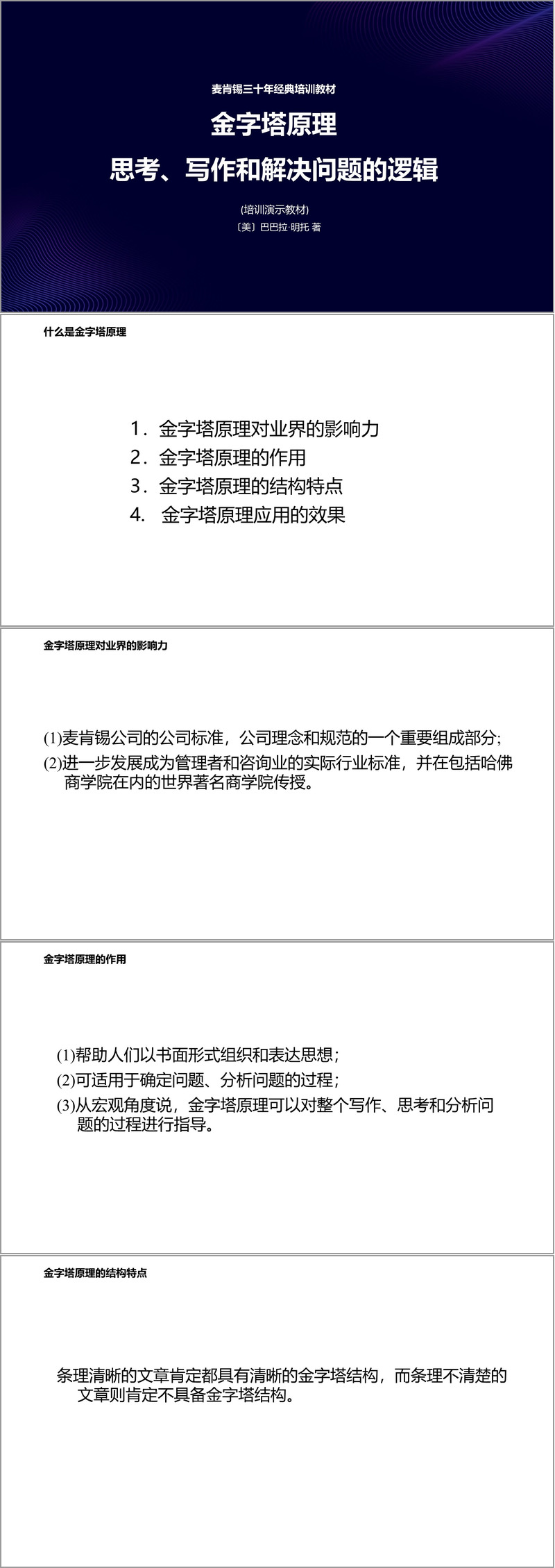 本文件作为麦肯锡经典培训教材,以 “金字塔原理” 为核心,系统拆解其在思考、写作、解决问题及演示四大场景的应用逻辑,构建了 “理论定义 - 结构解析 - 实践方法 - 场景落地” 的完整知识体系,为职场人士提升逻辑表达与问题解决能力提供标准化方法论,兼具理论深度与实操指导性。