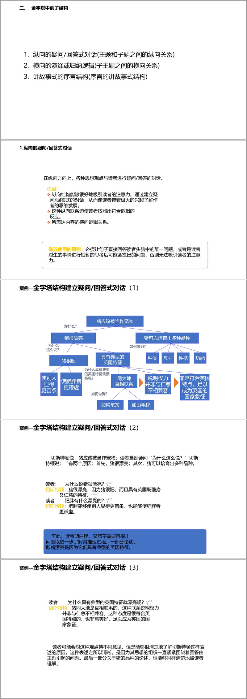 核心部分围绕金字塔原理在四大场景的应用展开深度解析。在写作逻辑上,首先解答 “为何选择金字塔结构”,指出人类认知习惯倾向于分组接收信息,自上而下的表达能让读者快速把握核心观点。接着拆解金字塔的三大子结构:纵向的 “疑问 / 回答式对话” 通过逐层回应读者潜在疑问吸引注意力,如论述 “猪应作为宠物” 时,需先回答 “为何漂亮”“肥胖为何算优点” 等衍生问题;横向的 “演绎 / 归纳逻辑” 要求同组思想只能选一种逻辑关系,演绎需遵循 “大前提 - 小前提 - 结论”(如 “人会死 - 苏格拉底是人 - 苏格拉底会死”),归纳则需提炼同组思想共性(如 “法德俄坦克抵波边境” 归纳为 “波兰或遭坦克入侵”);序言的 “讲故事结构” 需包含 “情境 - 冲突 - 疑问 - 回答” 四要素,例如商业备忘录可从 “公司多元化业务增长”(情境)切入,引出 “无法证明业务价值”(冲突),进而提出 “如何确保业务效益”(疑问)与 “实施公司发展项目”(回答)。同时,提供 “自上而下构建(先定主题与论点,再补论据)” 与 “自下而上构建(先列要点,再找逻辑,最后提炼结论)” 两种实操方法,并强调序言需聚焦已知事实,关键句层级优先用归纳法以降低读者理解成本。