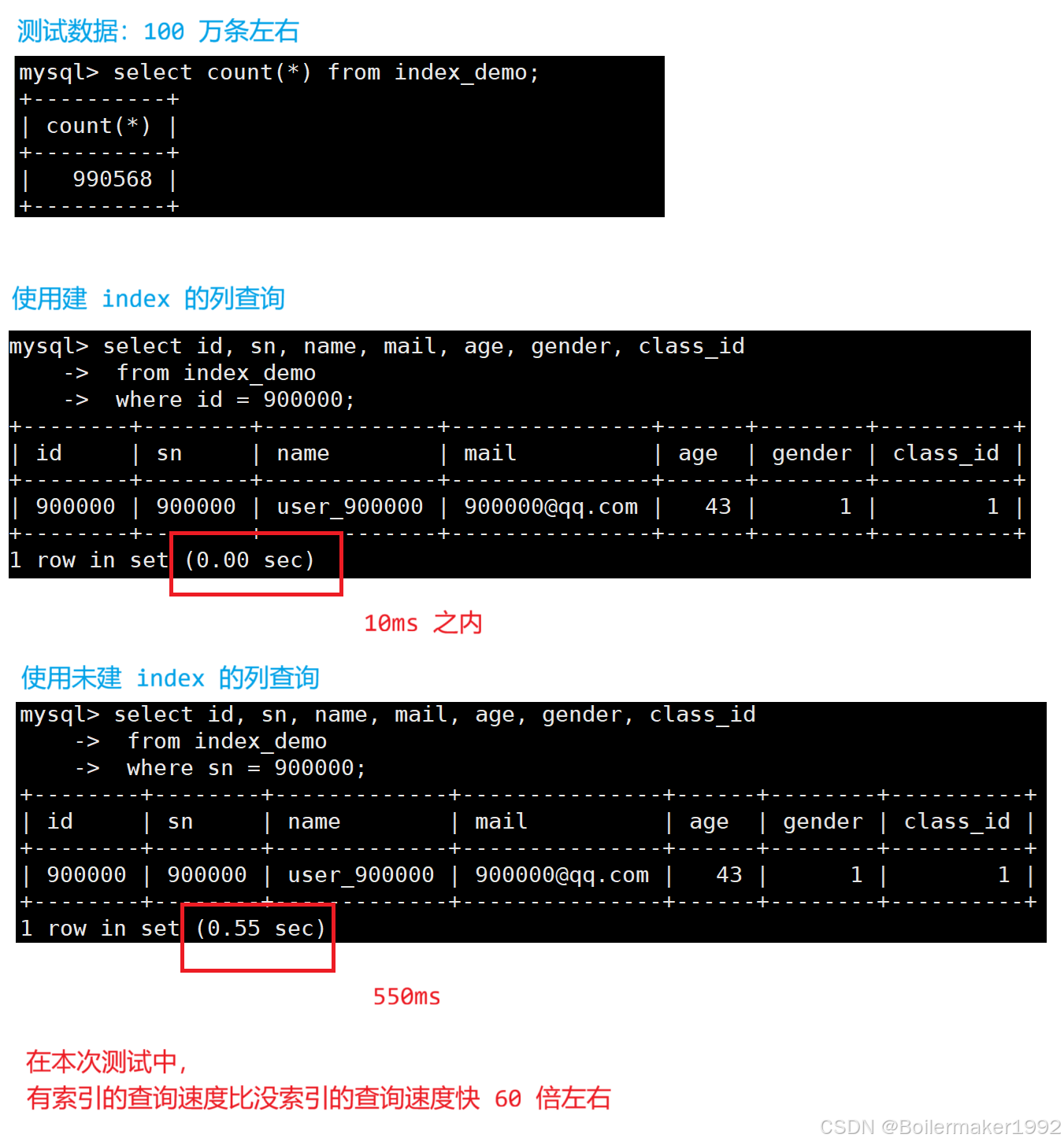 总结:性能的差异主要来自于需要扫描的数据量。从 const 到 ALL,需要扫描的数据量依次增加。const、eq_ref、ref 利用索引直接定位到一行或多行,range 扫描一个范围,index 扫描整个索引(比 ALL好很多,因为索引的大小比表数据小),ALL 扫描整个表。