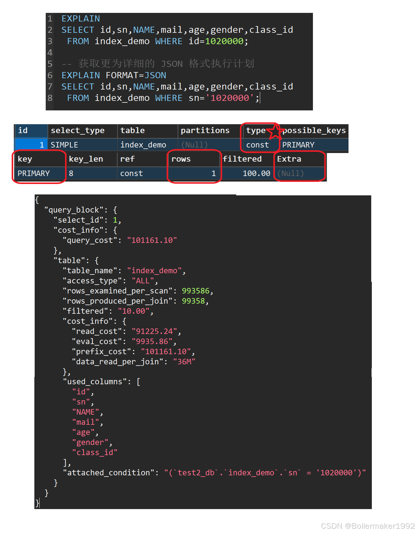 EXPLAIN 返回的结果中,最重要的字段是 type,其次是 key、rows、extra。