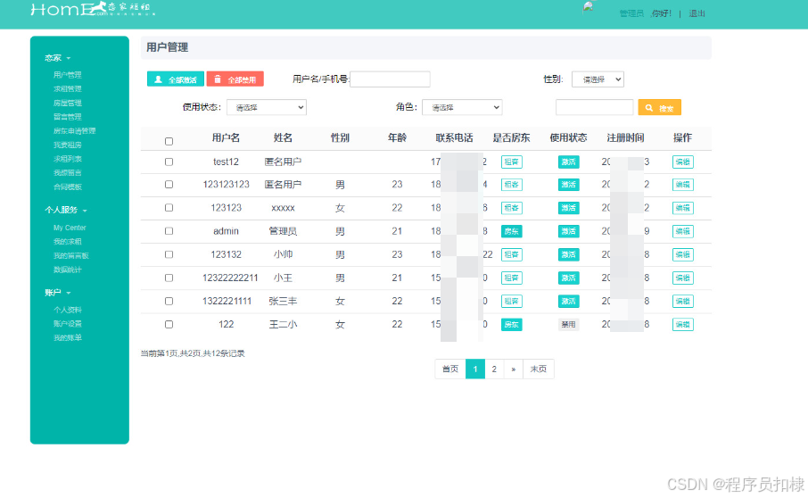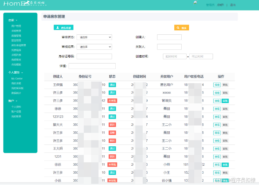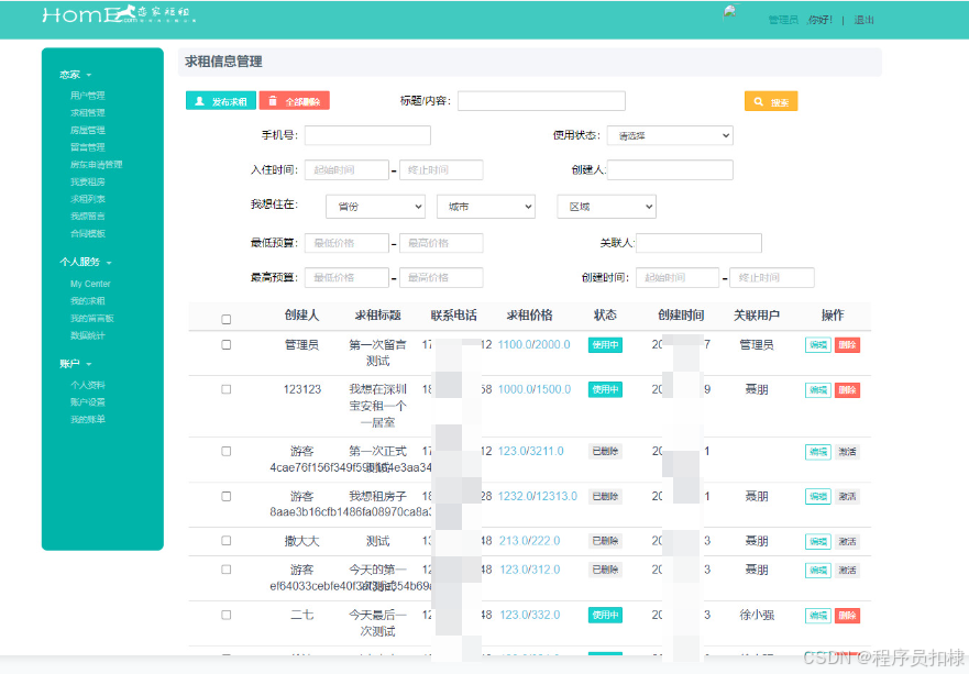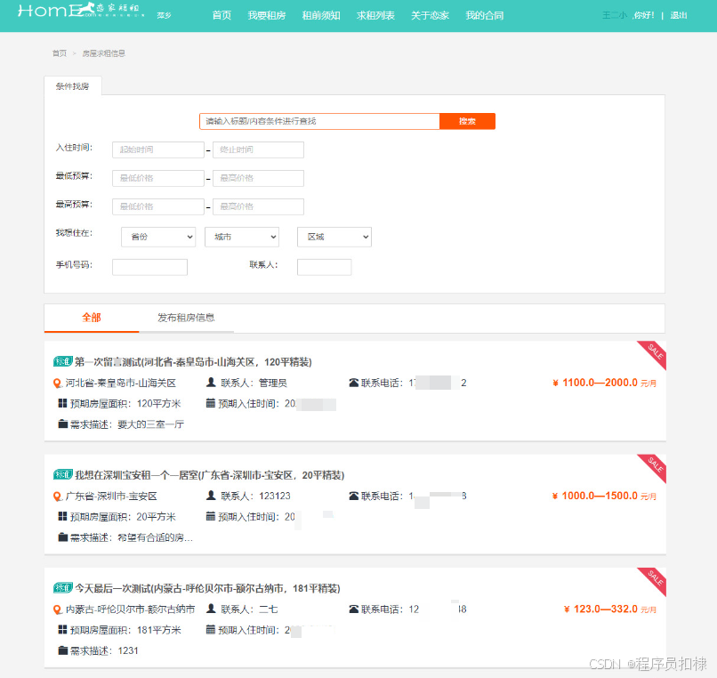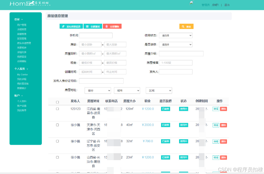 后台:房源信息的管理、房源信息的管理、留言信息的管理、求租信息的管理、留言投诉管理、用户管理等。