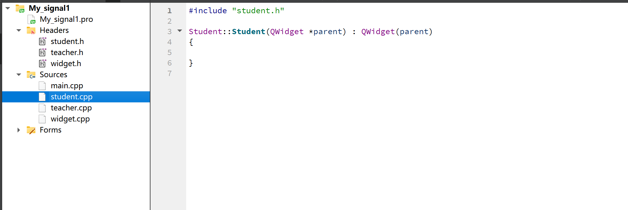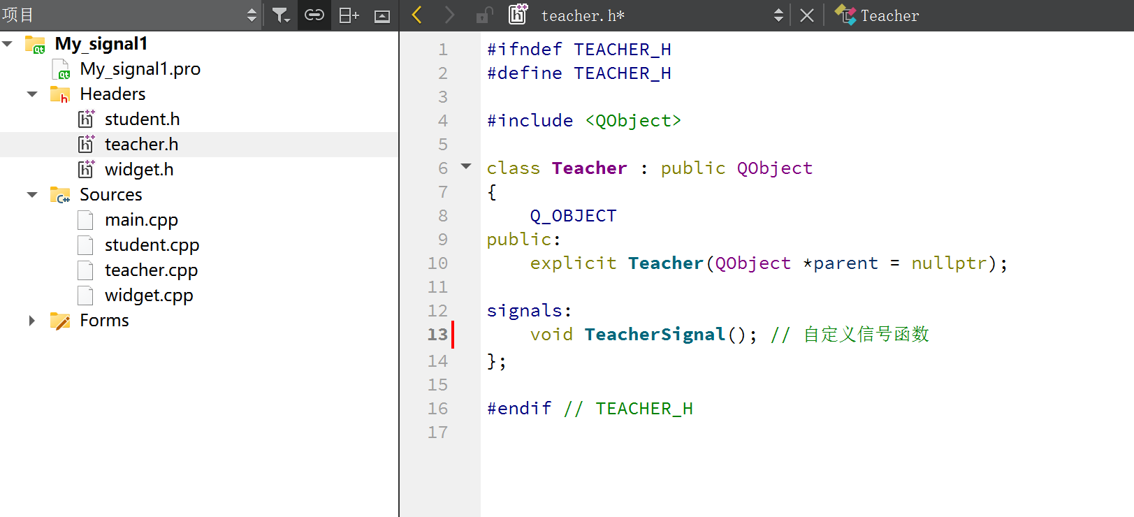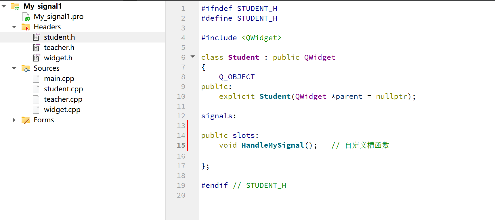 1.3.3. 分别在teacher.h和student.h两个文件中分别加上自定义函数声明和槽函数声明
