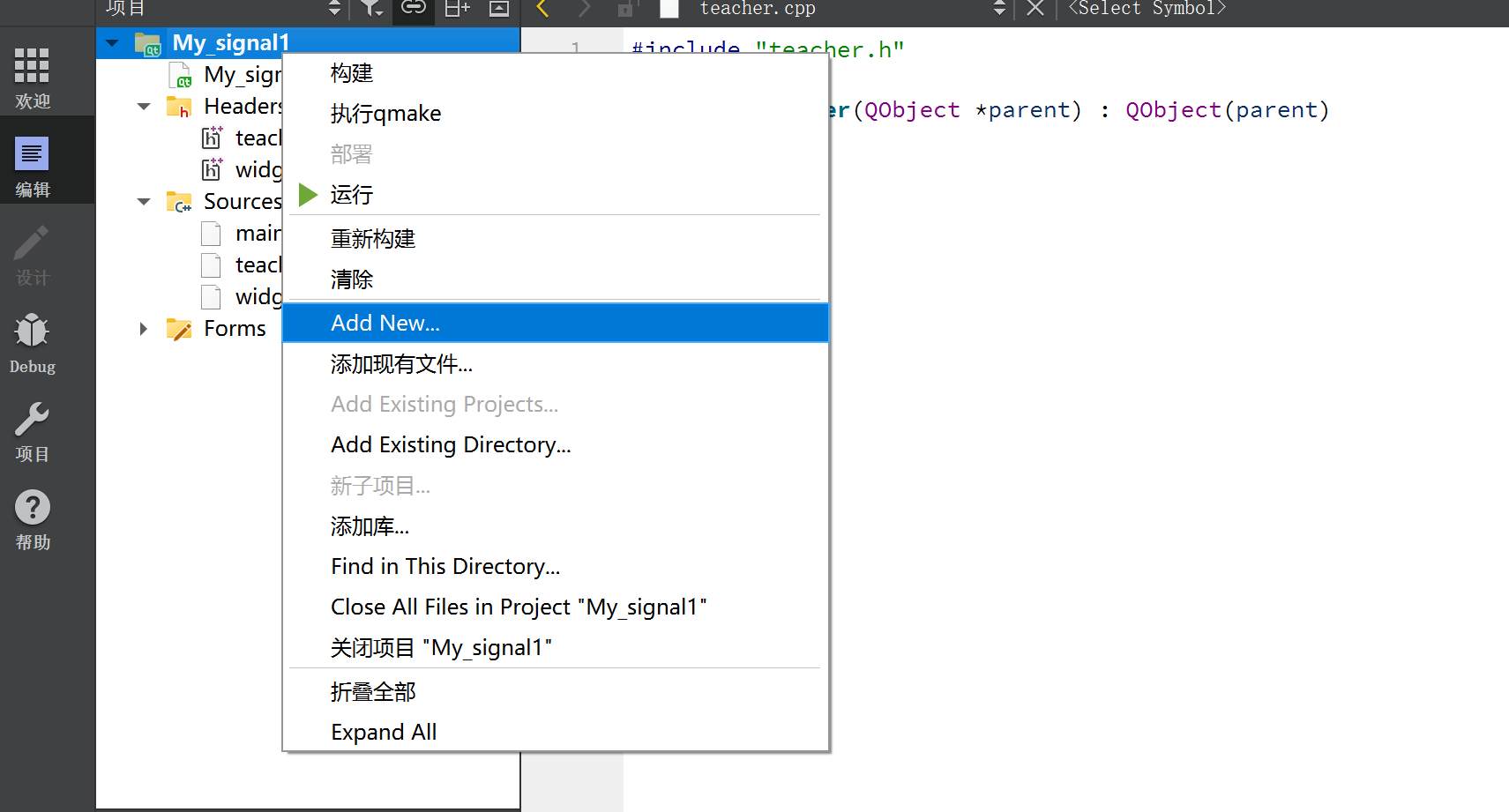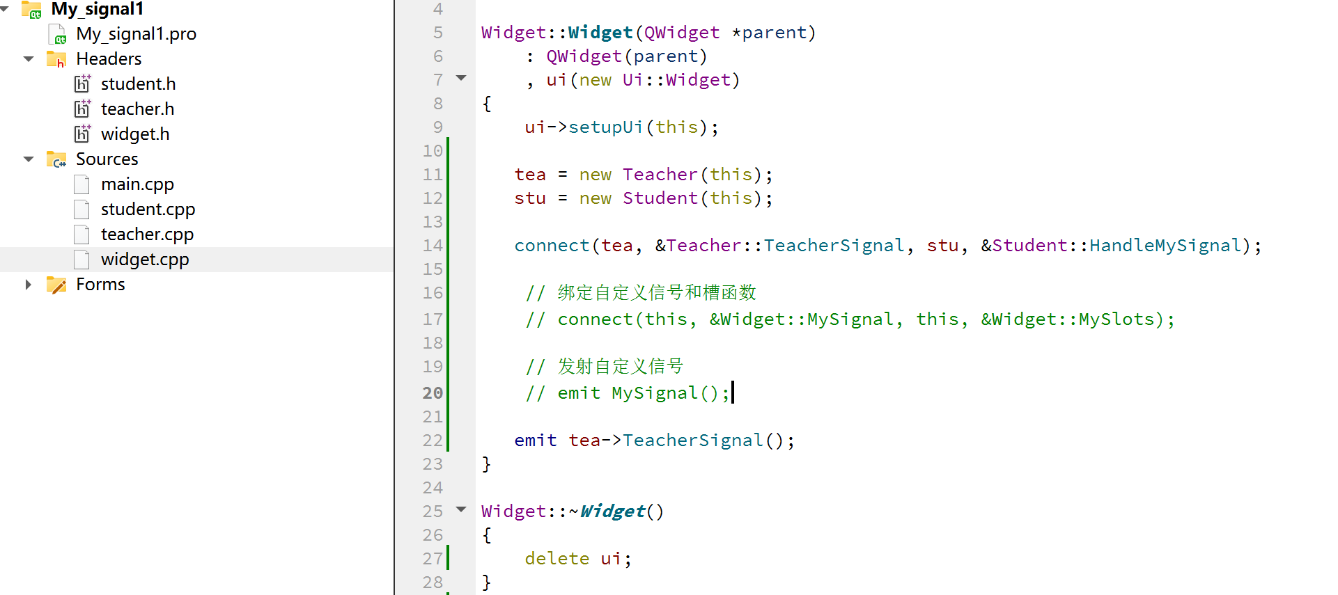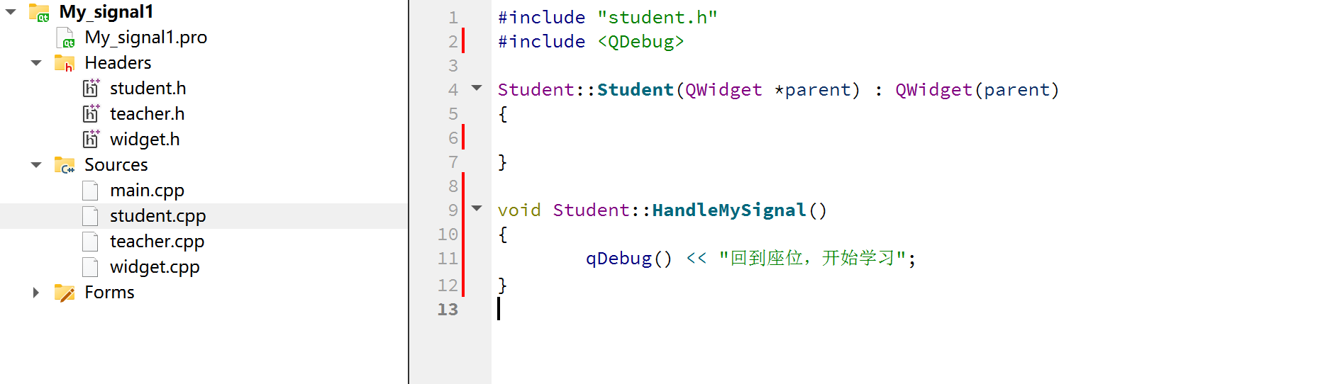 1.3.3. 分别在teacher.h和student.h两个文件中分别加上自定义函数声明和槽函数声明
