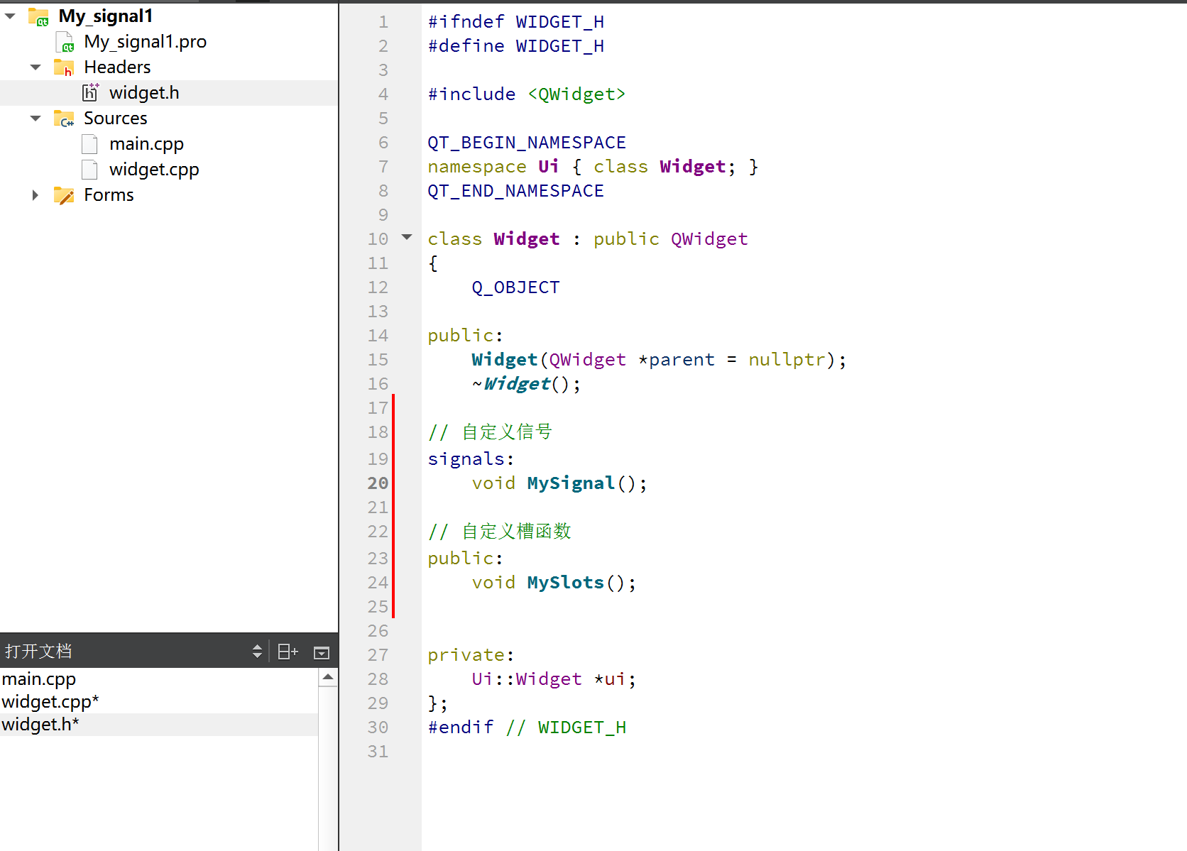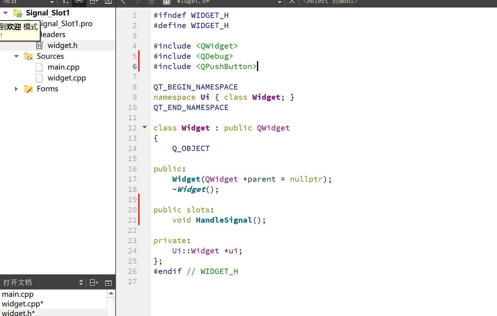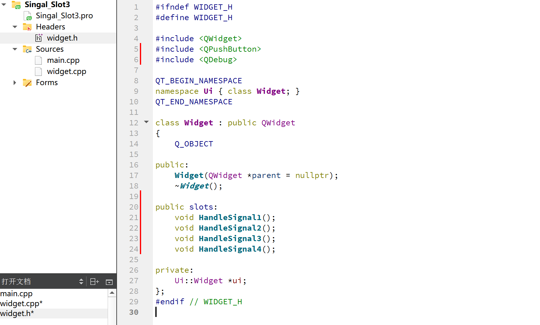 1.2.1. 先在widget.h中声明自定义函数和槽函数