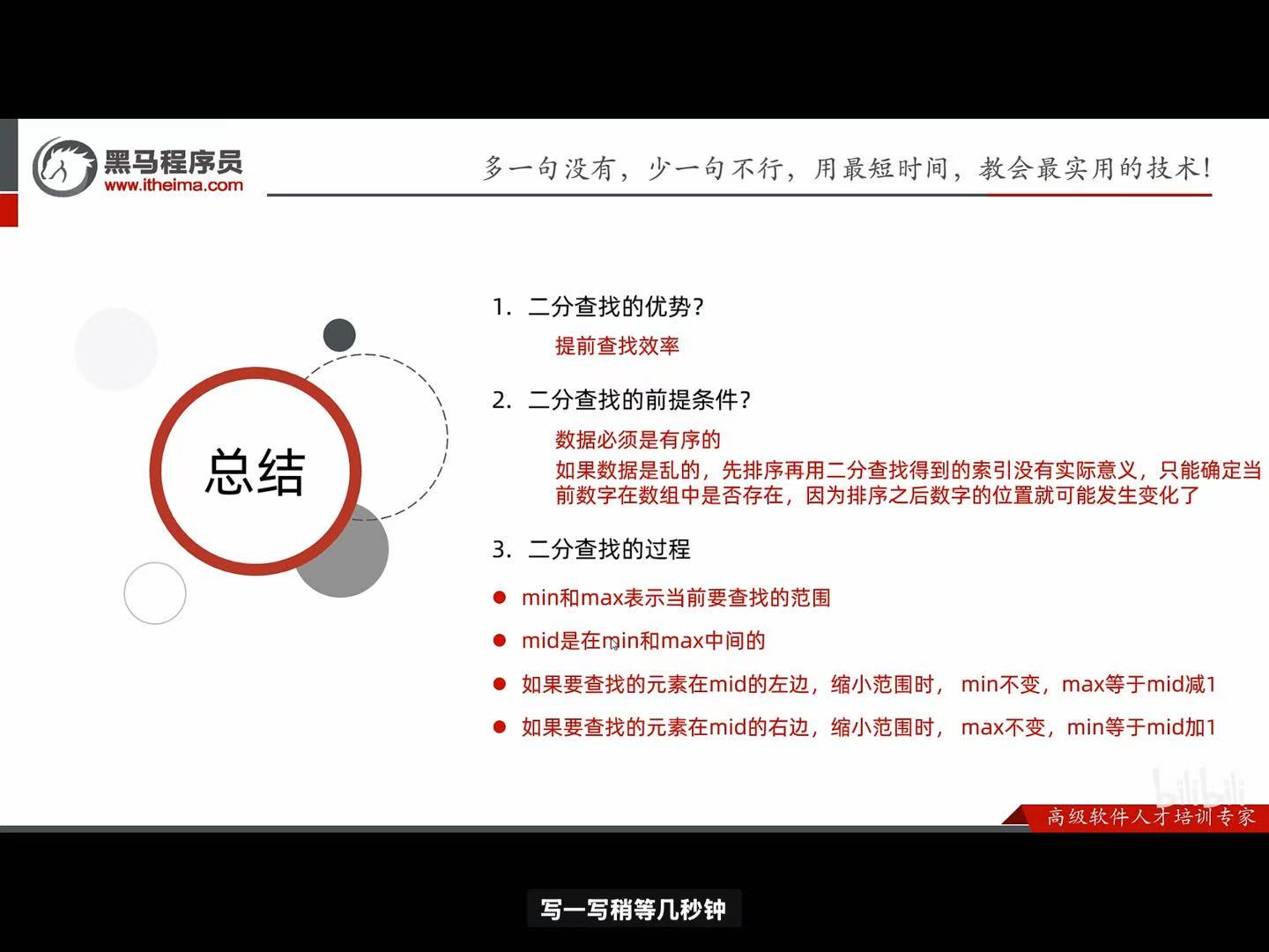 package com.search;public class half_search {public static void main(String[] args) {//1、先定义一个数组int []arr={15,20,28,36,89,123,144};System.out.println(HalfSearch(arr,150));}//2、再定义一个方法二分查找public static int HalfSearch(int[] arr, int e){int min=0;int max=arr.length-1;while(true){if(min>max){return -1;}int mid=(max+min)/2;if(arr[mid]>e){max=mid-1;}else if(arr[mid]<e){min=mid+1;}else{return mid;}}}