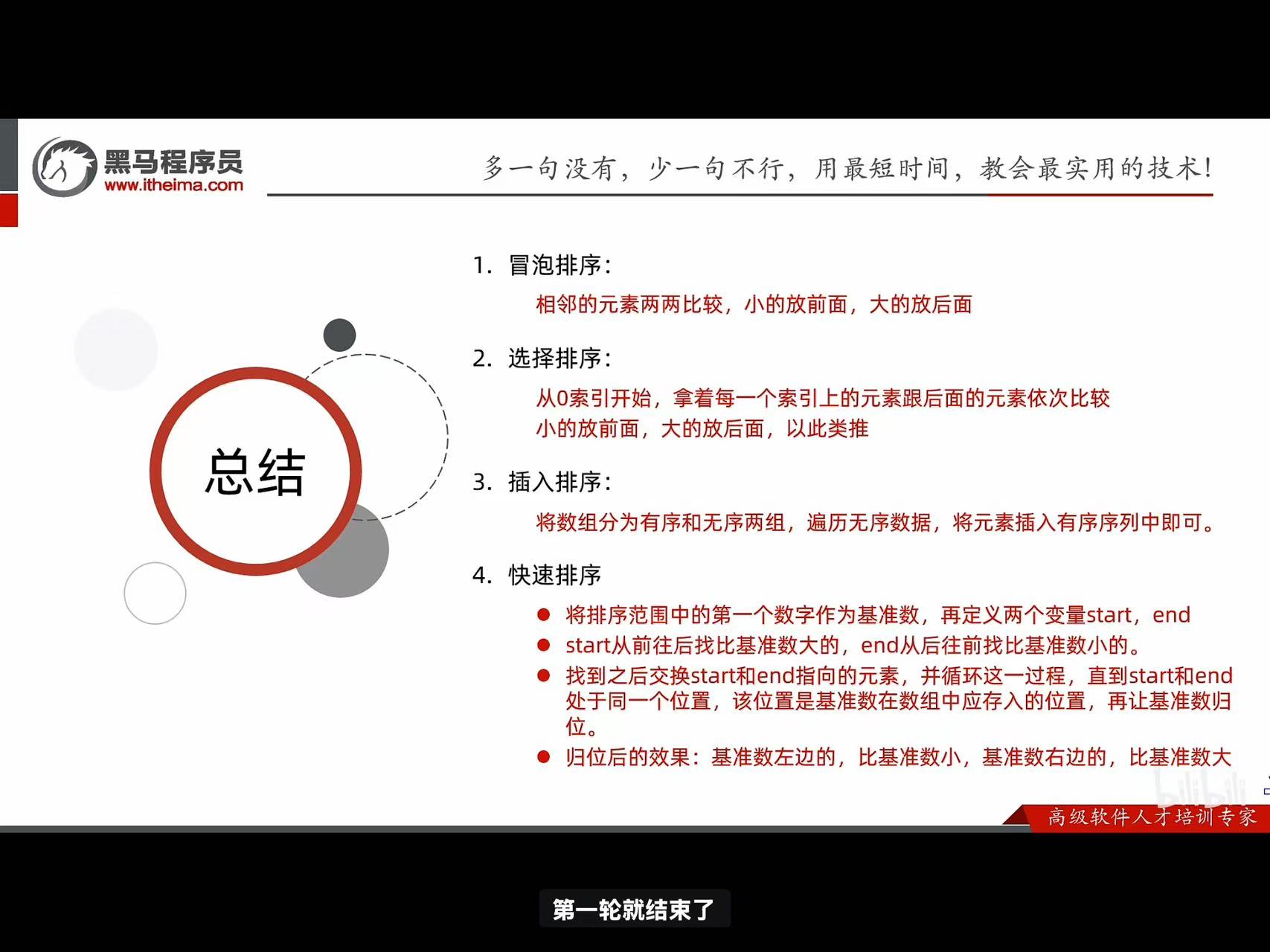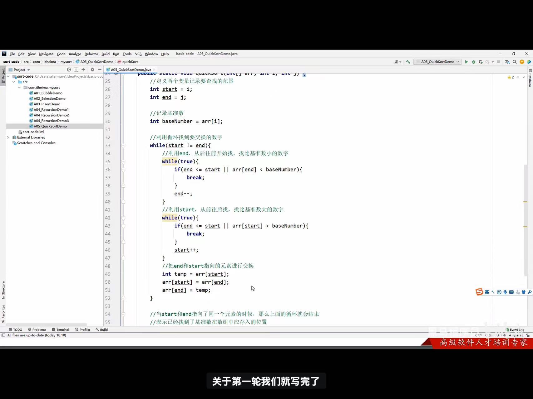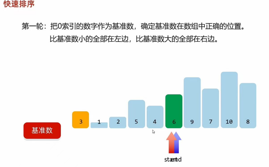 package com.sort;import java.util.Arrays;public class QuickSort {public static void main(String[] args) {int [] arr={9,2,5,7,6,4,3};QuickSort(arr,0,arr.length-1);System.out.println(Arrays.toString(arr));}public static void QuickSort(int []arr,int start,int end){//最后一定不要忘了写出口!!!if(start>end){return;}//要先有基准元素int BaseElem=arr[start];int i=start;int j=end;//必须先右指针while(i!=j){while(true){if(i==j||arr[j]<BaseElem){break;}j--;}//之后才是左指针while (true){if(i==j||arr[i]>BaseElem){break;}i++;}//此时找到了左右指针对应的元素,进行交换int tmp=arr[i];arr[i]=arr[j];arr[j]=tmp;}//当这样一个循环完成之后,i=j=baseElem应该存放的地方//将基准元素放到i=j之处,算是完成一次“归位”int tmpp=arr[start];arr[start]=arr[i];arr[i]=tmpp;QuickSort(arr,start,i-1);QuickSort(arr,i+1,end);}