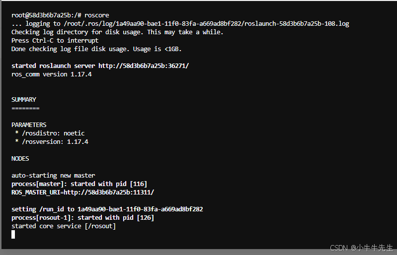 终端隔离:roscore 启动后,当前终端不能关闭(关闭会终止核心服务),所有其他操作需在新的终端中执行(若用 Docker 容器,需重新 docker exec -it 容器ID bash 进入新终端)若其他终端提示 roscore: command not found,需先加载 ROS 环境