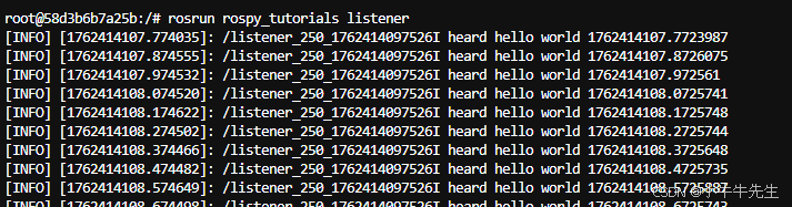 rosrun rospy_tutorials listener看到类似下图中的输出类似,则表示启动成功并且接收到了消息: