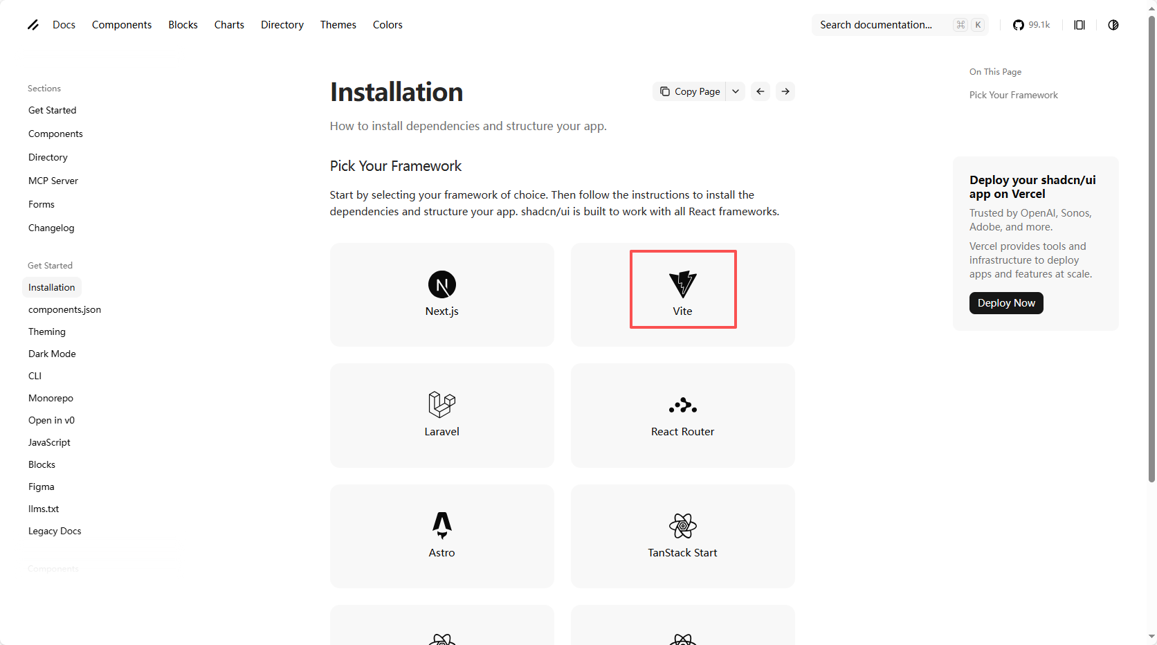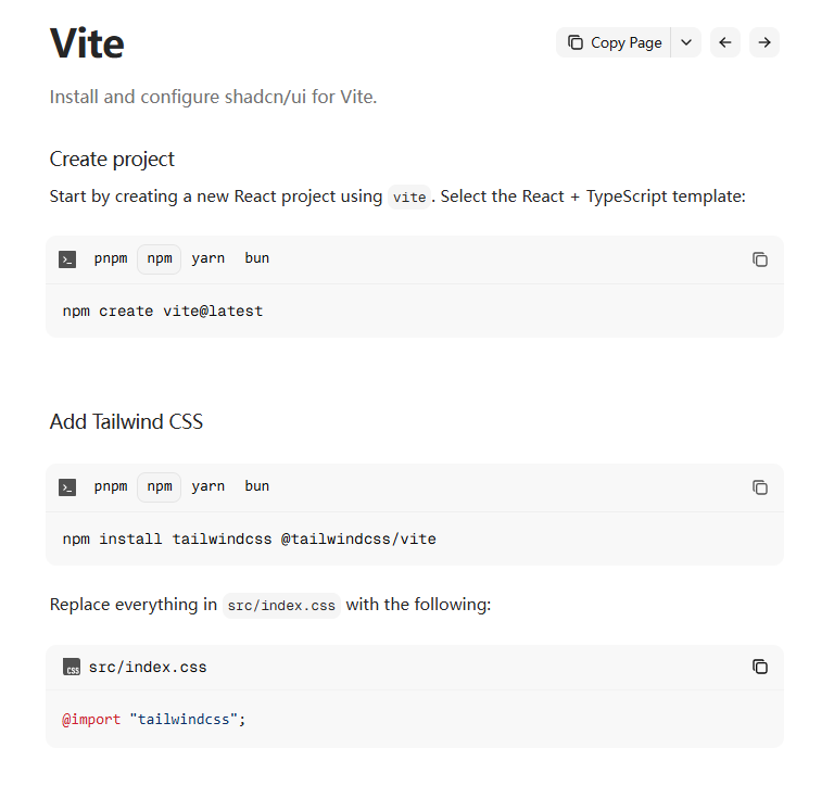 5、打开https://ui.shadcn.com/docs/installation网址,选择vite
