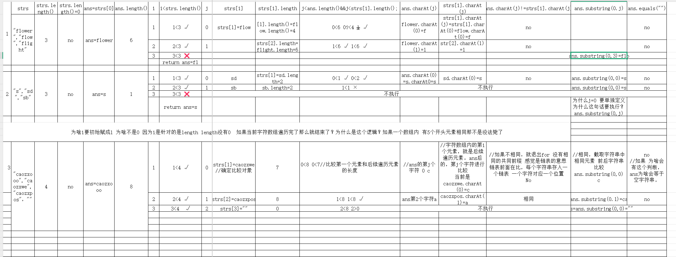 | 2 | 1 | flower | 1<6 1<strs[2].length=6 ok | ans.charAt(1)=l | strs[i].charAt(j)=strs[2].charAt[1]=flight.charAt[1]=l | ans= |