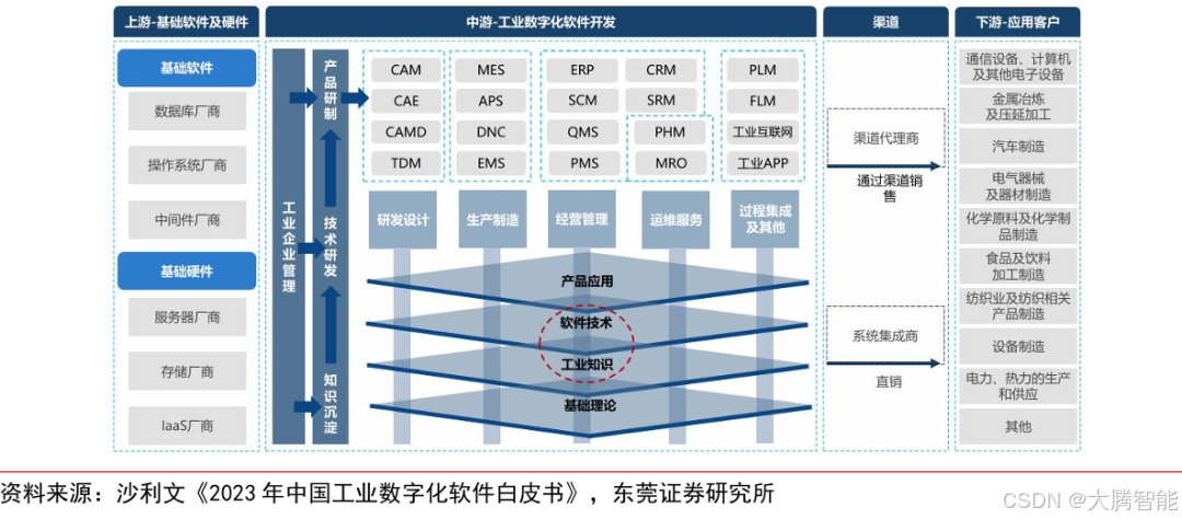 国家战略层面将工业软件纳入新基建七大领域,通过顶层设计为国产替代提供制度保障与资源倾斜,体现了突破技术垄断、保障产业链安全的战略决心。 政策东风之下,工业互联网与工业软件呈现深度融合、互相成就的发展态势。工业互联网平台为工业软件提供了运行载体与数据接口,而工业软件则通过工业知识软件化过程,将制造业的工艺参数、流程经验转化为可复用的数字化模型,提升了制造业数字化转型的效率与深度。市场应用来看,制造业全链路数字化转型催生了对工业软件的刚性需求。从产品设计环节的CAD、CAE,到生产制造环节的MES、PLC控制系统,再到企业运营管控的ERP、SCM系统,工业软件已成为支撑智能制造的“数字底座”。