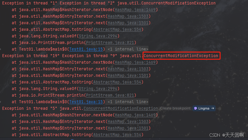 产生这个异常主要是由于多线程并发修改HashMap导致的。当一个线程正在遍历或打印map的内容时,另一个线程同时修改了map结构,就会触发此异常。