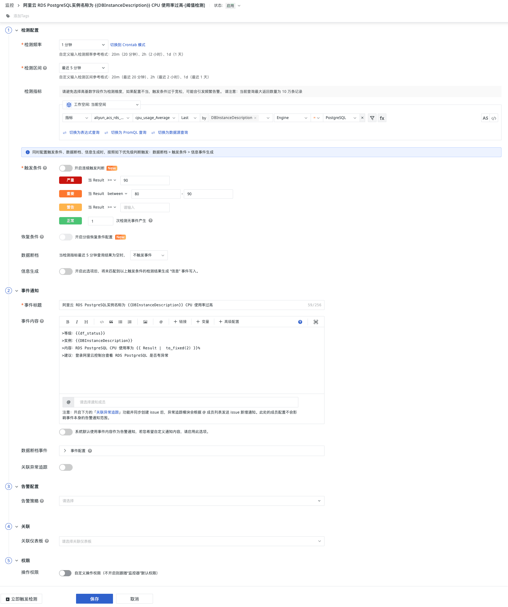 该告警配置针对阿里云 PostgreSQL 数据库的 CPU 使用率进行监控,检测频率为每分钟 1 次,检测区间为最近 5 分钟。当 CPU 使用平均值持续高于 90% 时触发严重告警,介于 80% 至 90% 时触发重现告警,并支持连续触发判断机制,确保及时感知数据库资源异常。