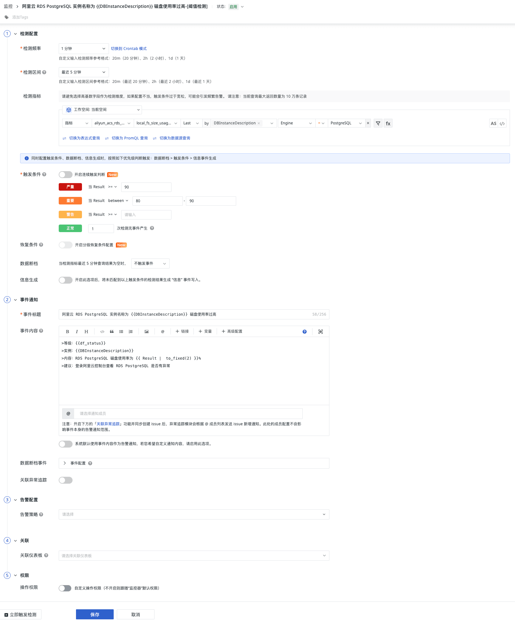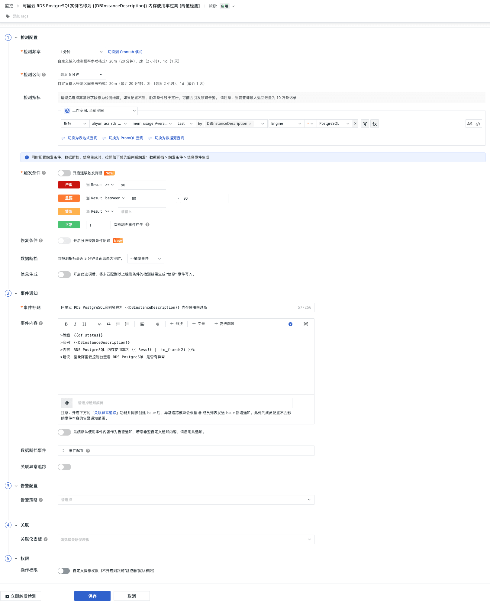 该告警配置针对阿里云 PostgreSQL 数据库的磁盘使用率进行监控,检测频率为每分钟一次,检测区间为最近 5 分钟。当内存使用平均值持续高于 90% 时触发严重告警,介于 80% 至 90% 时触发重现告警,并支持连续触发判断机制,确保及时感知数据库资源异常。