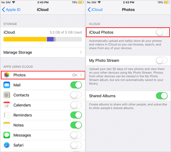 - 打开“共享相册”。此外,确保“iCloud照片”也已启用。(无法连接到iCloud服务器?)