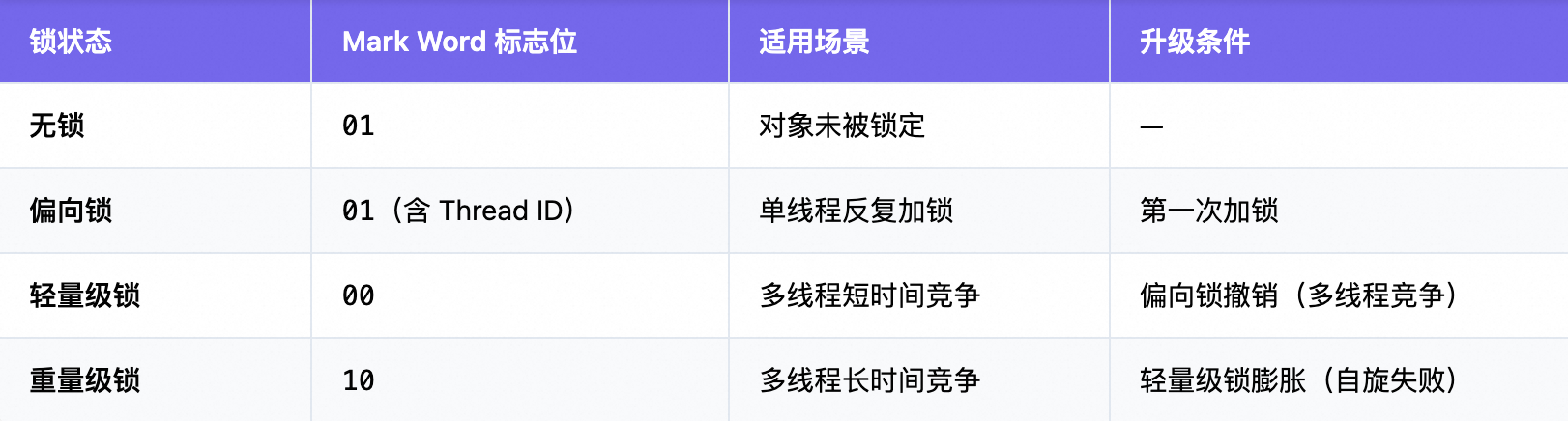 JVM 为减少无竞争时的同步开销,设计了 4 级锁状态,根据竞争激烈程度动态升级。