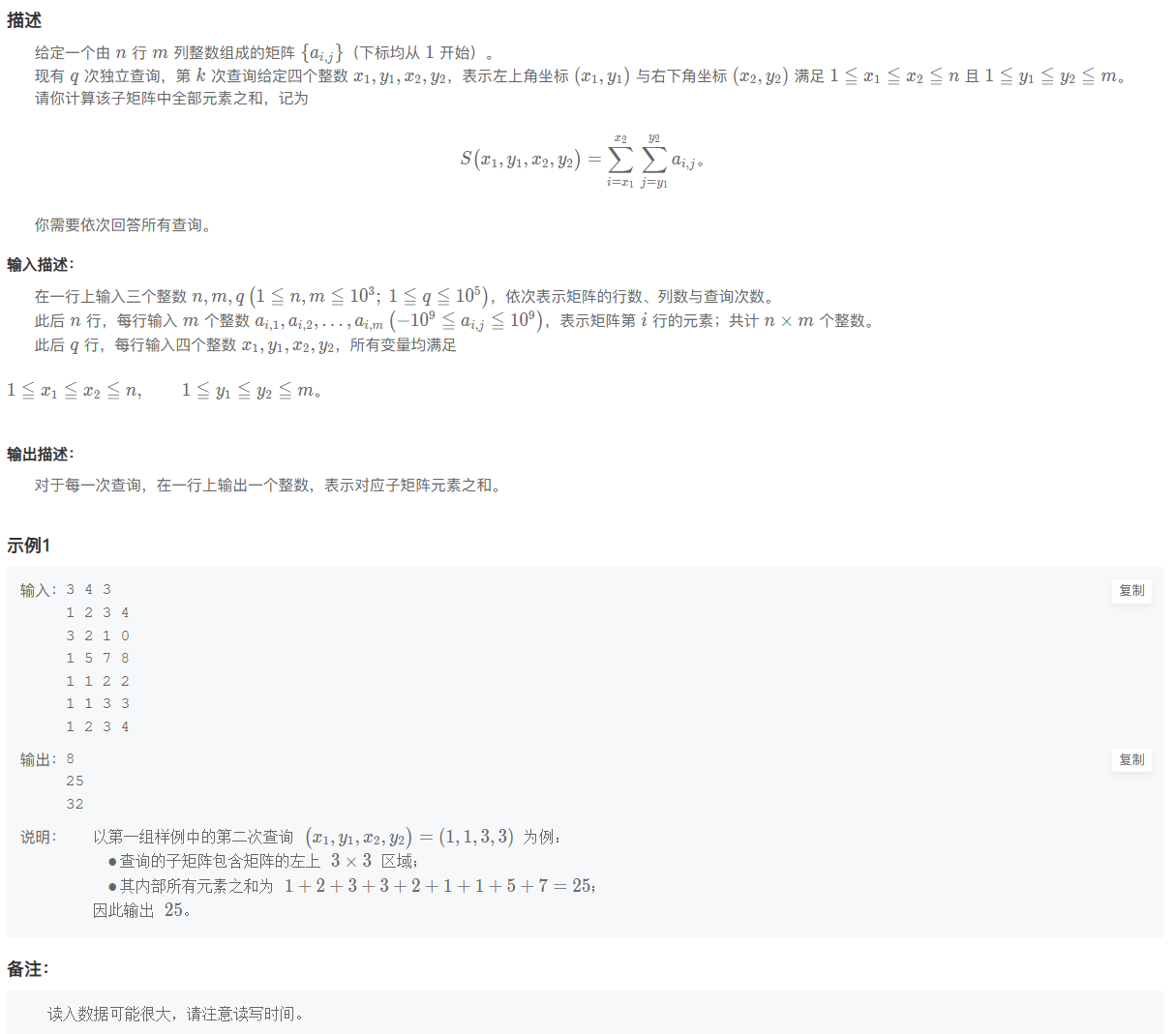 - 有q次查询,每次查询给定子矩阵的左上角坐标和右下角坐标,输出子矩阵中所有元素的累加和。