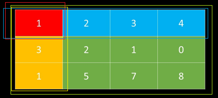 - 我们可以开个二维数组 a[i][j] 表示前i行且列数<=j 的所有元素之和,如果i=3,j=4那么就是下图所有元素之和,然后对矩阵进行预处理,得到对应的前缀和矩阵。