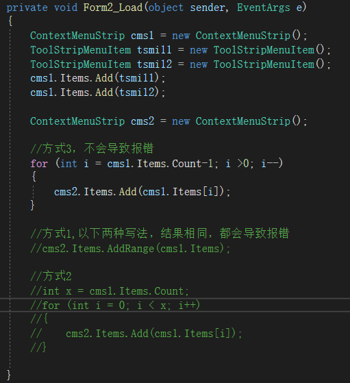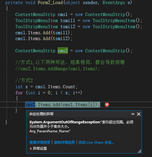 报错的原因就找到了,即图1中,第一次进入循环后,i=0,cms1中索引0处的item被添加到了cms2中,cms1中剩余一个item,第二次进入循环后,i=1,cms1中索引1处没有item,引发报错。我们可以用下图的方式实现这个功能,即从后往前去添加: