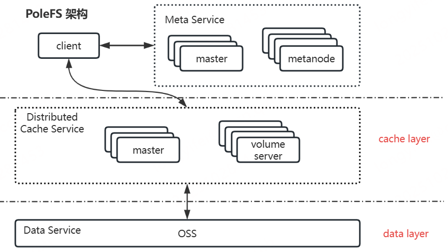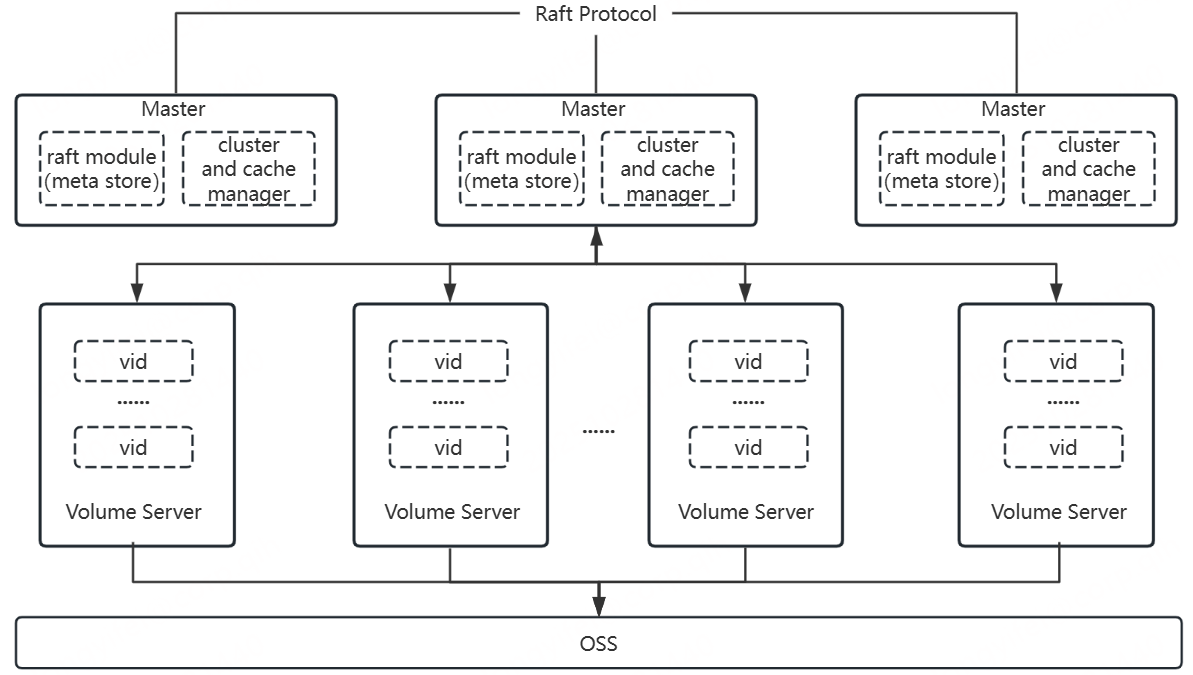 blobcache是PoleFS的分布式缓存子系统,能够为PoleFS提供高性能、高可靠、高可用的分布式缓存服务。其介于客户端与OSS(基于S3协议的对象存储)中间,充当数据缓存层;核心职责主要包括两部分,一部分是要保障上层写入数据安全可靠地转存到底层对象存储OSS,另一部分则是要高效地利用缓存空间提高上层对数据的访问性能。blobcache具体包括master和volume server两个组件,其中,master组件主要负责集群以及缓存信息的管理(内部通过raft协议保障数据的可靠性);volume server组件主要负责缓存数据的存储、下刷以及访问。