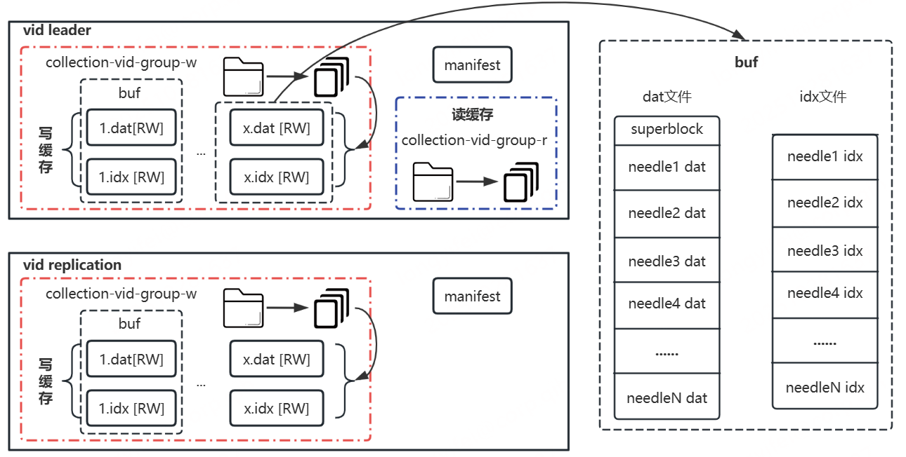 vid是数据管理的基本单元,具体包括写缓存和读缓存(只有vid leader有)以及manifest文件。其中,写缓存采用多buf设计,每个buf都包含有一对dat(用于存储数据)和idx(用于存储数据对应索引)文件,buf内最小数据存储单元为needle,相应一个buf包含若干needle;读缓存对应一个目录,目录下包含若干数据文件(与底层对象存储OSS的object一一对应);manifest文件主要用于记录vid缓存相关信息。整体如下图所示: