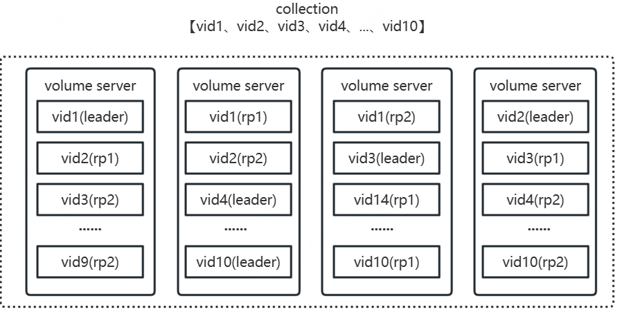 collection是用户为文件系统卷创建的缓存集合,由若干vid(3副本,一主两从)组成,根据分配策略每个vid副本在满足故障域的情况下会均匀散列在集群的各个volume server上。其中,选择volume server的策略是基于节点的权重值,权重值与volume server剩余未使用的逻辑空间大小呈正相关,剩余逻辑空间越大,权重越大,以保障每个volume server使用的逻辑空间均衡。