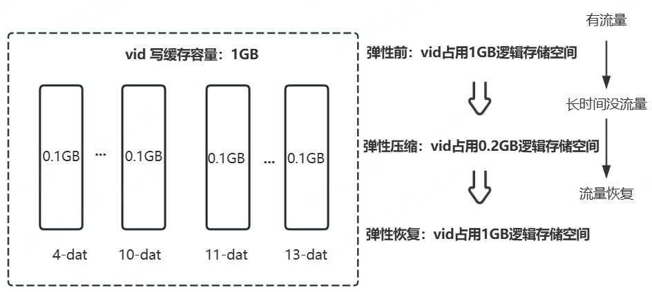 当长时间未使用的缓存突然使用,底层检测到流量则会将缓存占用的空间大小弹性调整到其配置的大小,以保障用户正常使用所需的缓存空间。