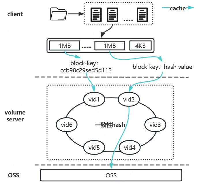 读数据:请求vid leader节点,内部按照写缓存、读缓存、底层对象存储OSS顺序依次进行读取,直到读成功后返回(如果从底层对象存储OSS读的,则异步将数据写到读缓存中)。