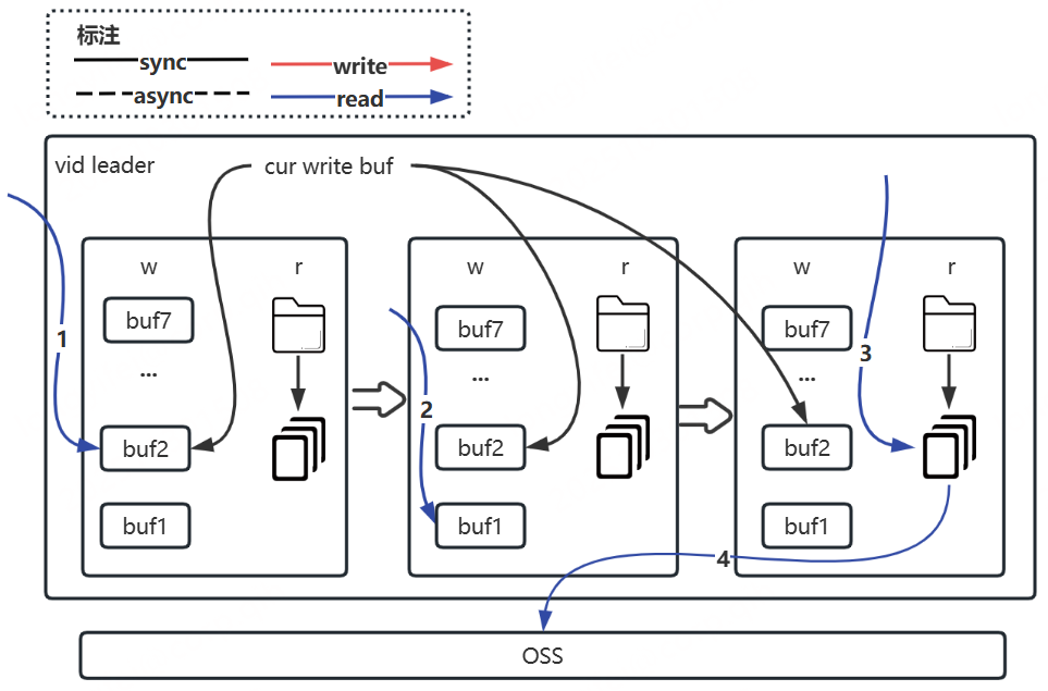 其中,从vid leader读数据,先根据当前写buf文件指向按照buf编号从大到小检索读取,如若未读到则继续从读缓存中检索读取,还未读到在从OSS中读取。大体如下图所示: