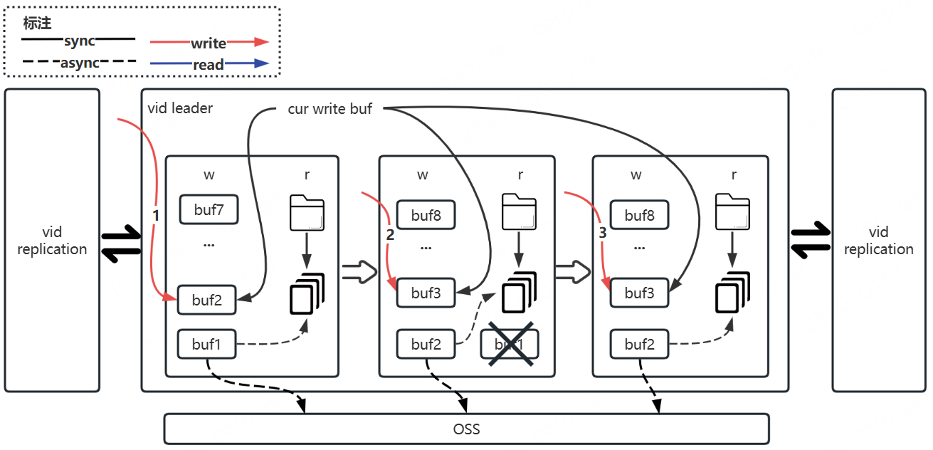 其中,往vid leader写数据,根据当前写buf文件指向按照buf编号从小到大写,buf写到上限则切换到下一个buf,已写满的buf数据全部下刷后将移除同时新增一个buf。大体如下图所示: