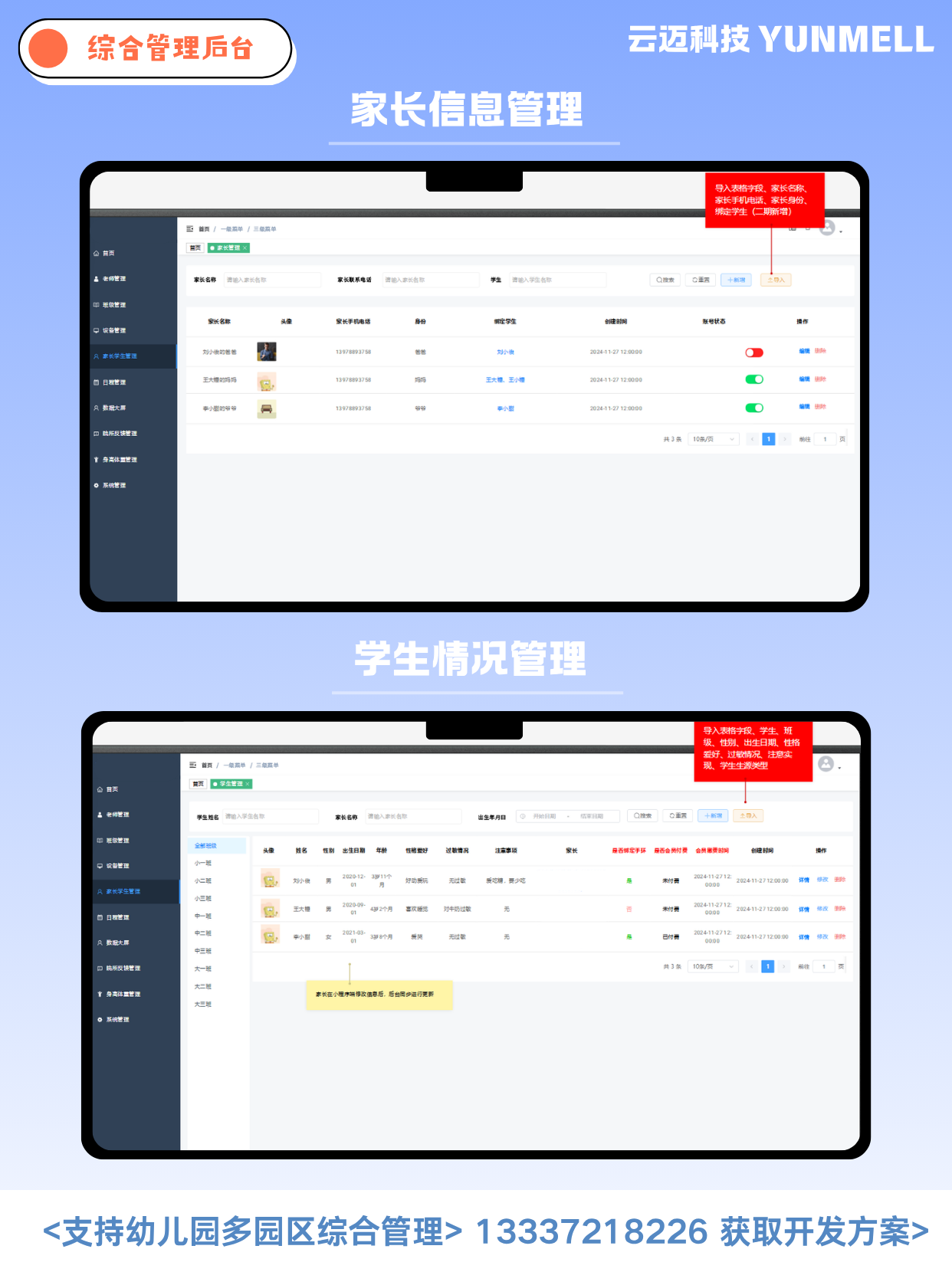 - 智能考勤与成长档案:结合人脸识别与 RFID 技术,自动生成幼儿出勤记录;通过智能表单采集幼儿行为数据,AI 算法自动生成成长分析报告;