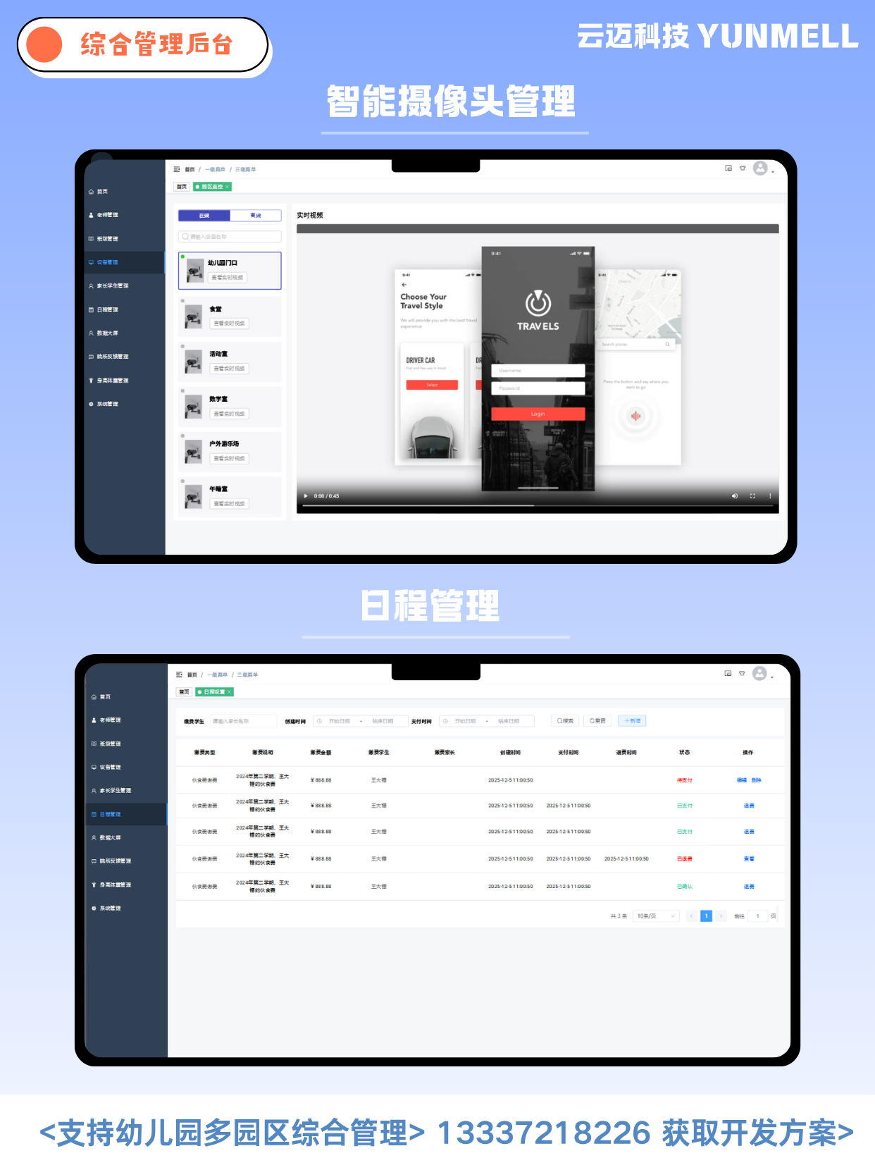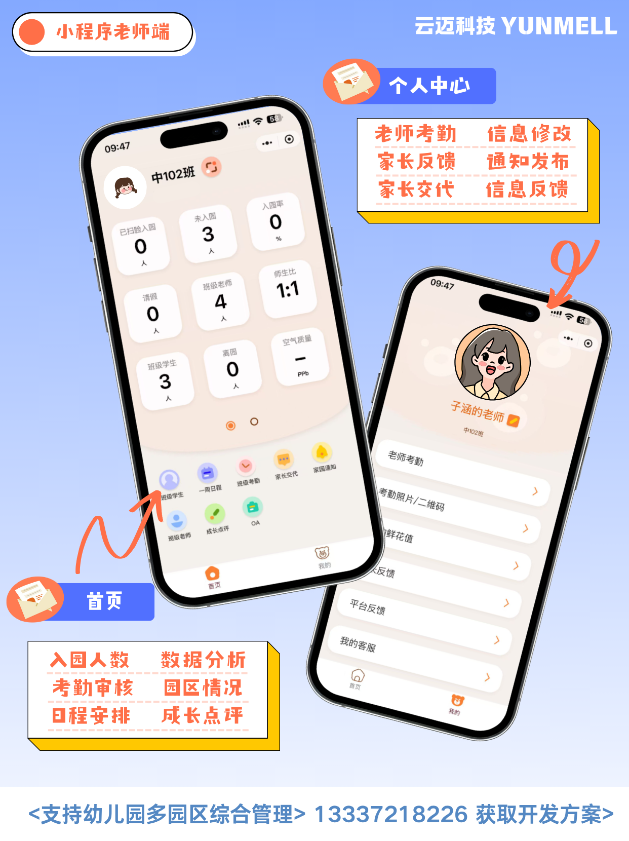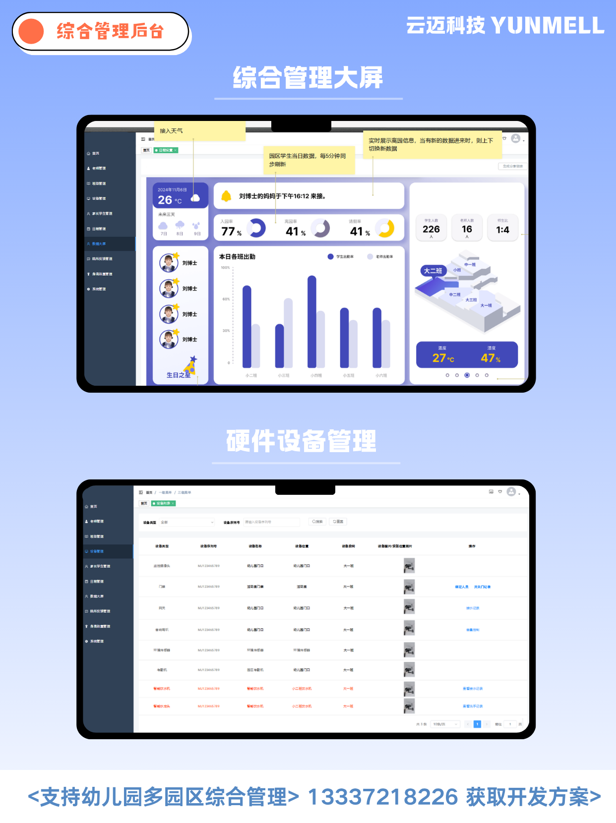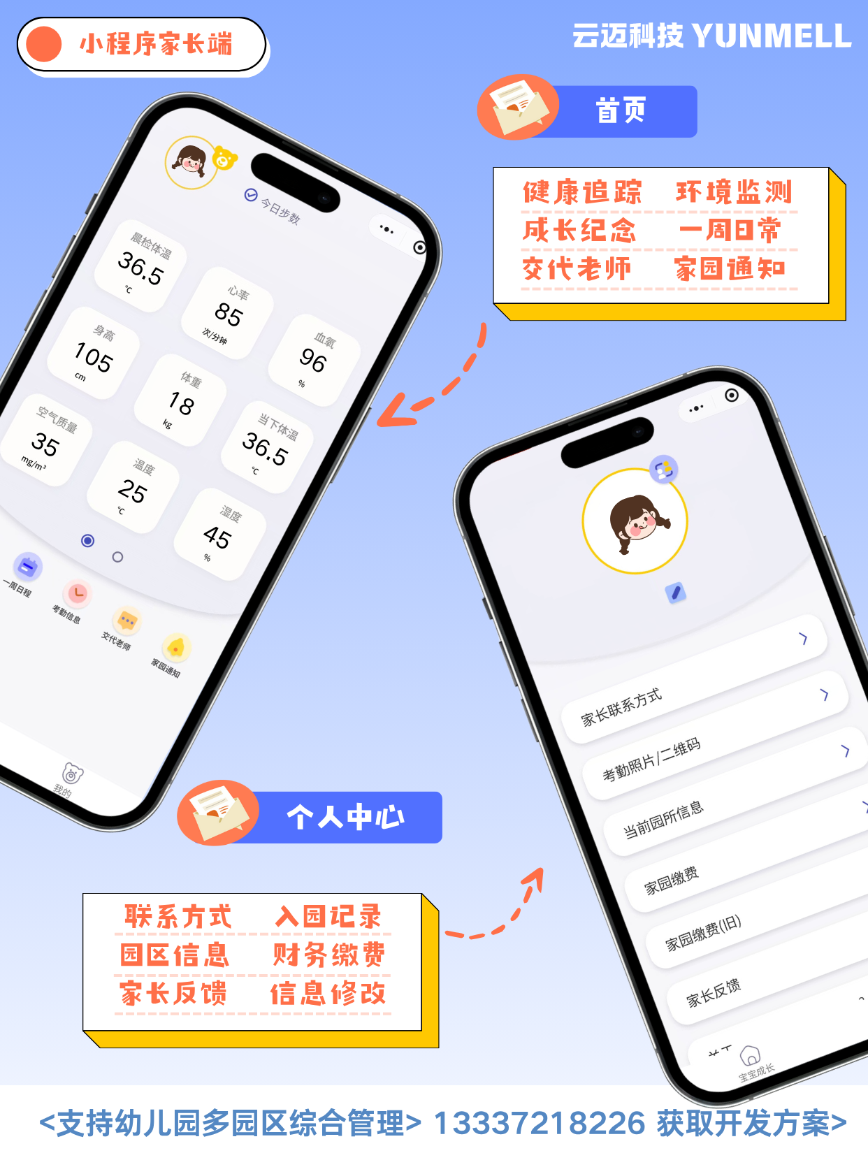 - 健康与安全溯源:物联网设备实时采集幼儿体温、园区 PM2.5、校车位置等数据,通过小程序以 Dashboard 形式呈现;
