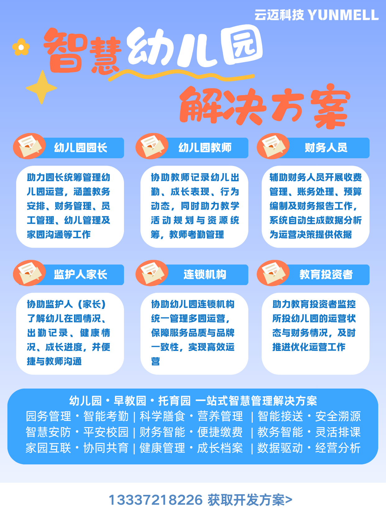 数字化浪潮下,智慧幼儿园管理系统不仅是技术工具,更是重构幼教管理逻辑的核心引擎。其技术实践为教育信息化细分领域的数字化转型提供了可复制的路径,推动学前教育向 “精细化、智能化、生态化” 迈进。