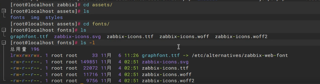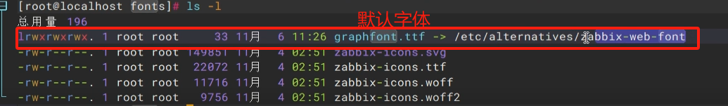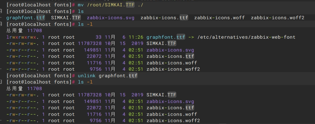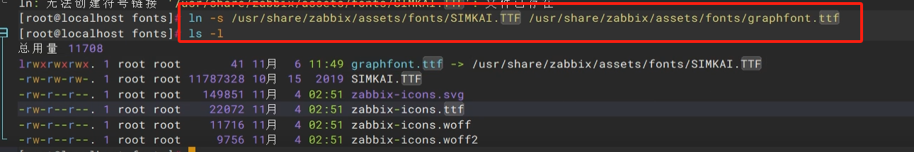 [root@localhost fonts]# ln -s /usr/share/zabbix/assets/fonts/STKAITI.TTF /usr/share/zabbix/assets/fonts/graphfont.ttf