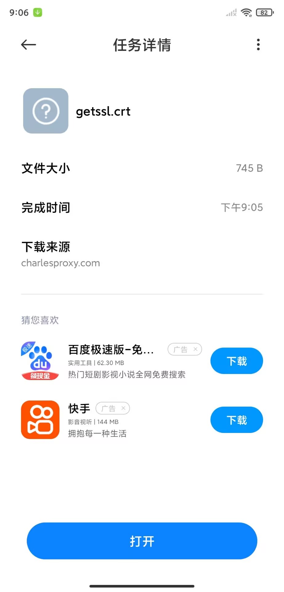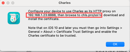 我生成的地址如下图,不管用ip+端口还是手机打开自带的浏览器输入chls.pro/ssl,一直提示打不开,不管怎么尝试,不知道什么原因。后面搜索了下其他同学的文章,采用了这个备用地址,尝试访问 charlesproxy.com/getssl,突然就成了,一时之间不知道该说啥,到处都是坑。