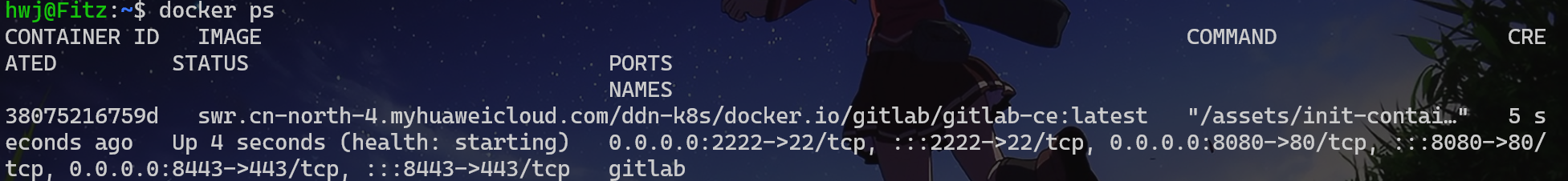 docker run -d \--hostname 192.168.1.100 \-p 8443:443 -p 8080:80 -p 2222:22 \--name gitlab \--restart always \-v ~/^Ctlab/config:/etc/gitlab \-v ~/gitlab/logs:/var/log/gitlab \-v ~/gitlab/data:/var/opt/gitlab \swr.cn-north-4.myhuaweicloud.com/ddn-k8s/docker.io/gitlab/gitlab-ce:latest