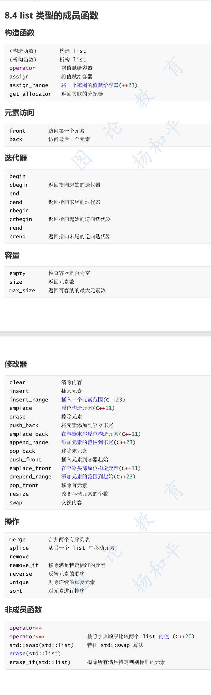 void list_special_operations() {list<int> lst = {1, 3, 5};// 任意位置高效插入(与vector/deque的最大区别!)auto it = lst.begin();advance(it, 1); // 移动到第2个位置lst.insert(it, 2); // 在位置1插入2: {1,2,3,5} - O(1)!// 任意位置高效删除it = lst.begin();advance(it, 2); // 移动到第3个位置 lst.erase(it); // 删除3: {1,2,5} - O(1)!// 头部尾部操作(与deque相同)lst.push_front(0); // 头部插入: {0,1,2,5}lst.push_back(6); // 尾部插入: {0,1,2,5,6}lst.pop_front(); // 头部删除: {1,2,5,6}lst.pop_back(); // 尾部删除: {1,2,5}