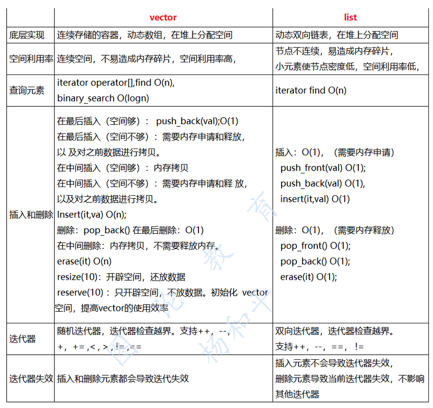 5)vector 一次性分配好内存,不够时才进行 2 倍扩容(或 1.5 倍);list 每次插入新节点都会进行内存申请。