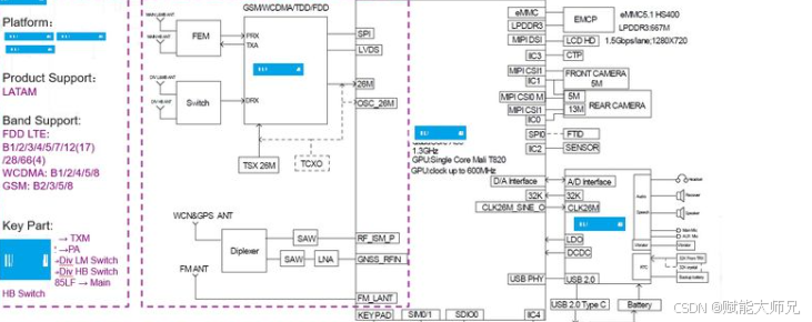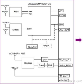 中间的虚线框是射频前端的简单框图,放这个图是为了下面介绍FDD制式的射频匹配调试。